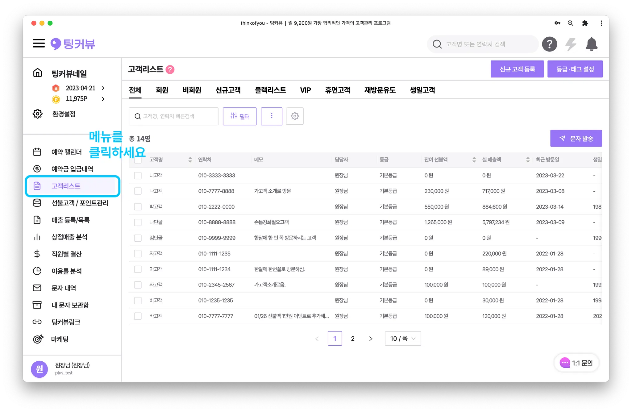 고객리스트에서 고객태그를 등록해볼까요? 왼쪽 사이드메뉴의 [고객리스트] 메뉴를 클릭해주세요.