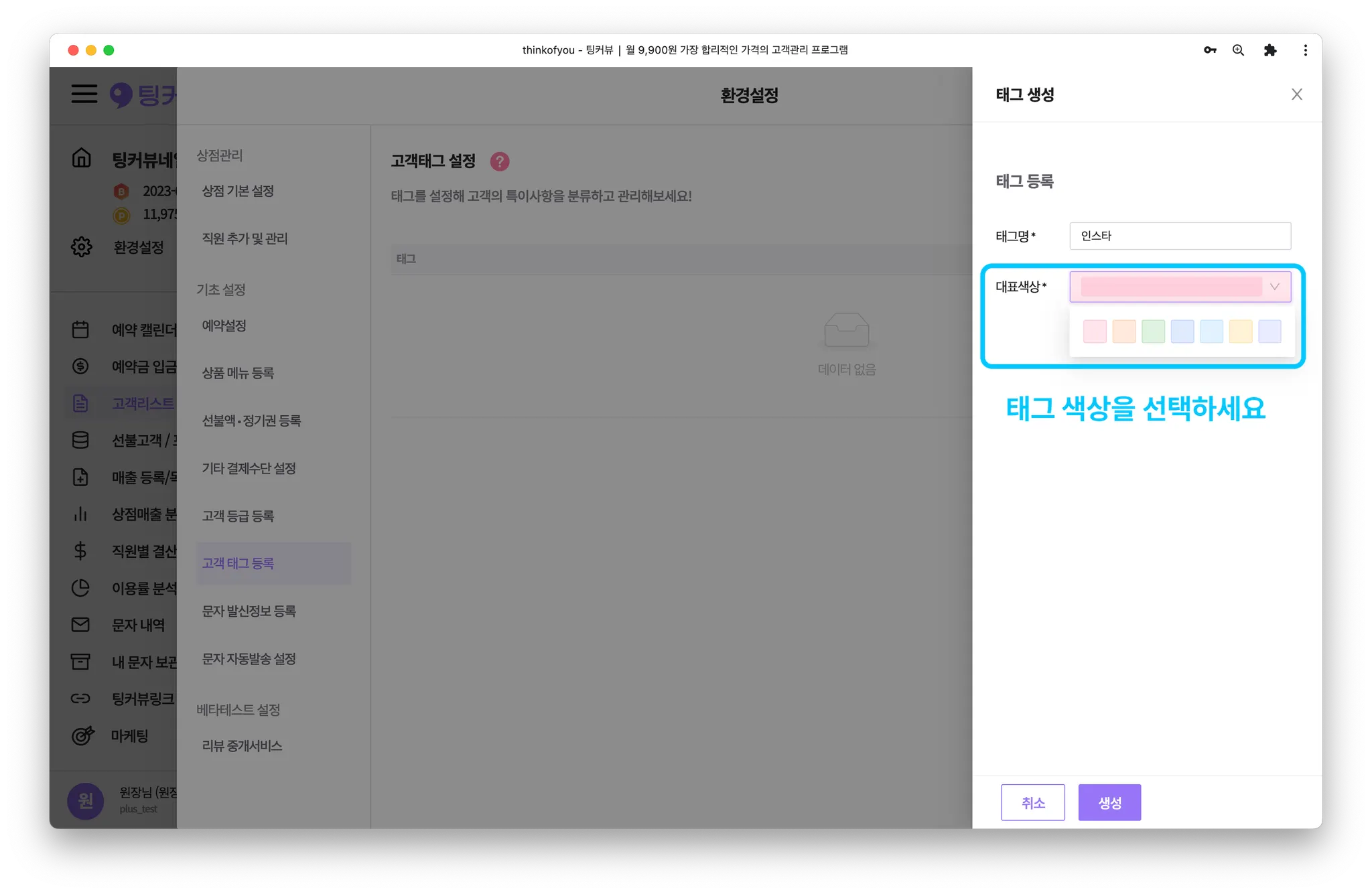 태그 생성창이 열리면 태그명을 입력하고 태그색상을 선택하세요.