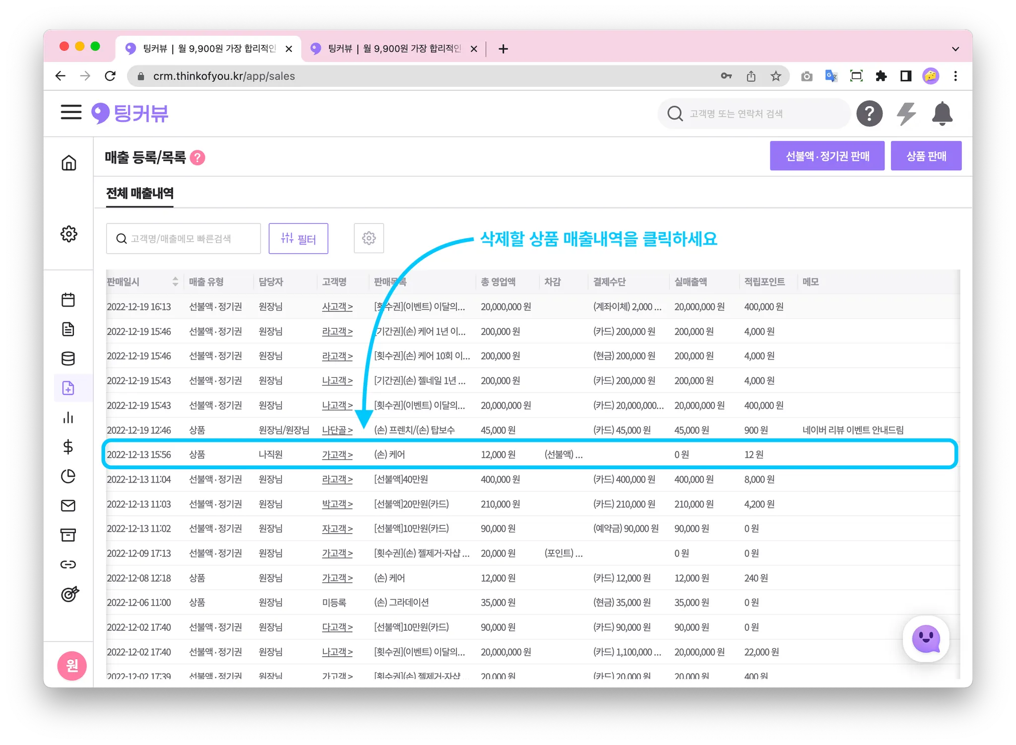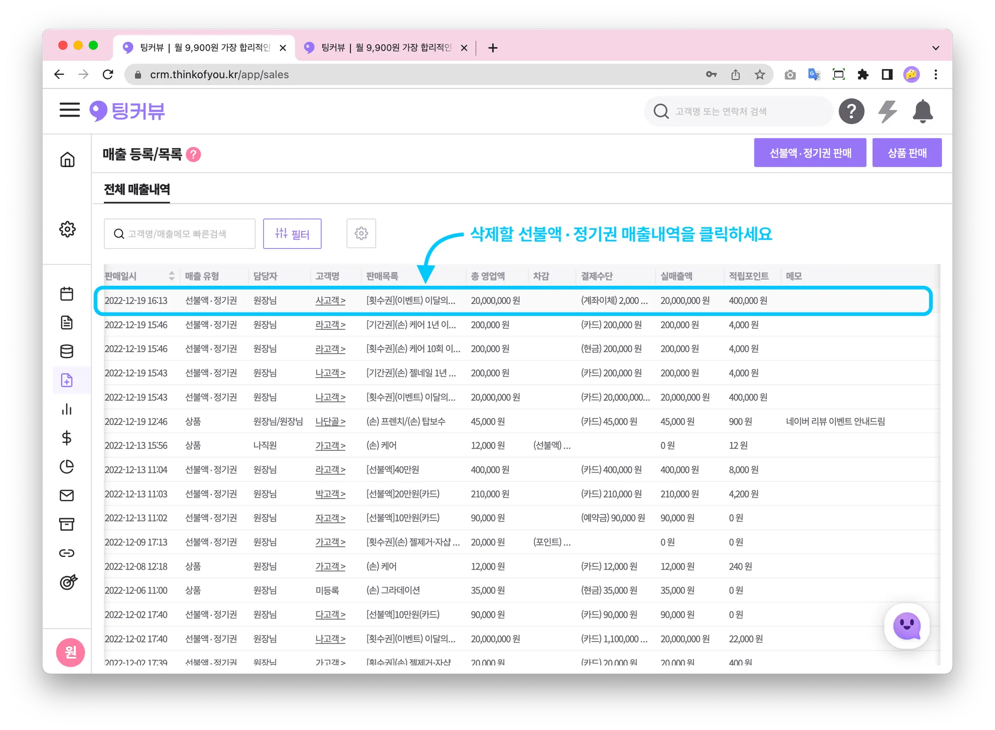 삭제할 선불액∙정기권 매출내역을 클릭하세요.