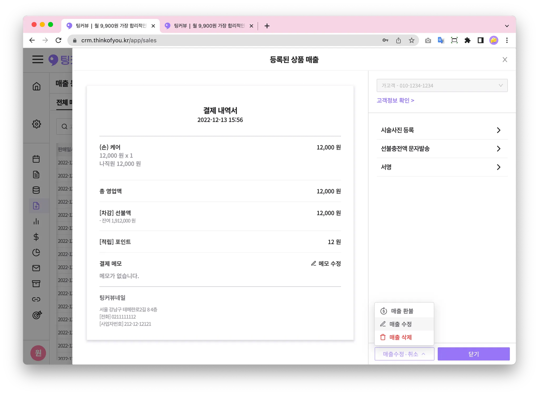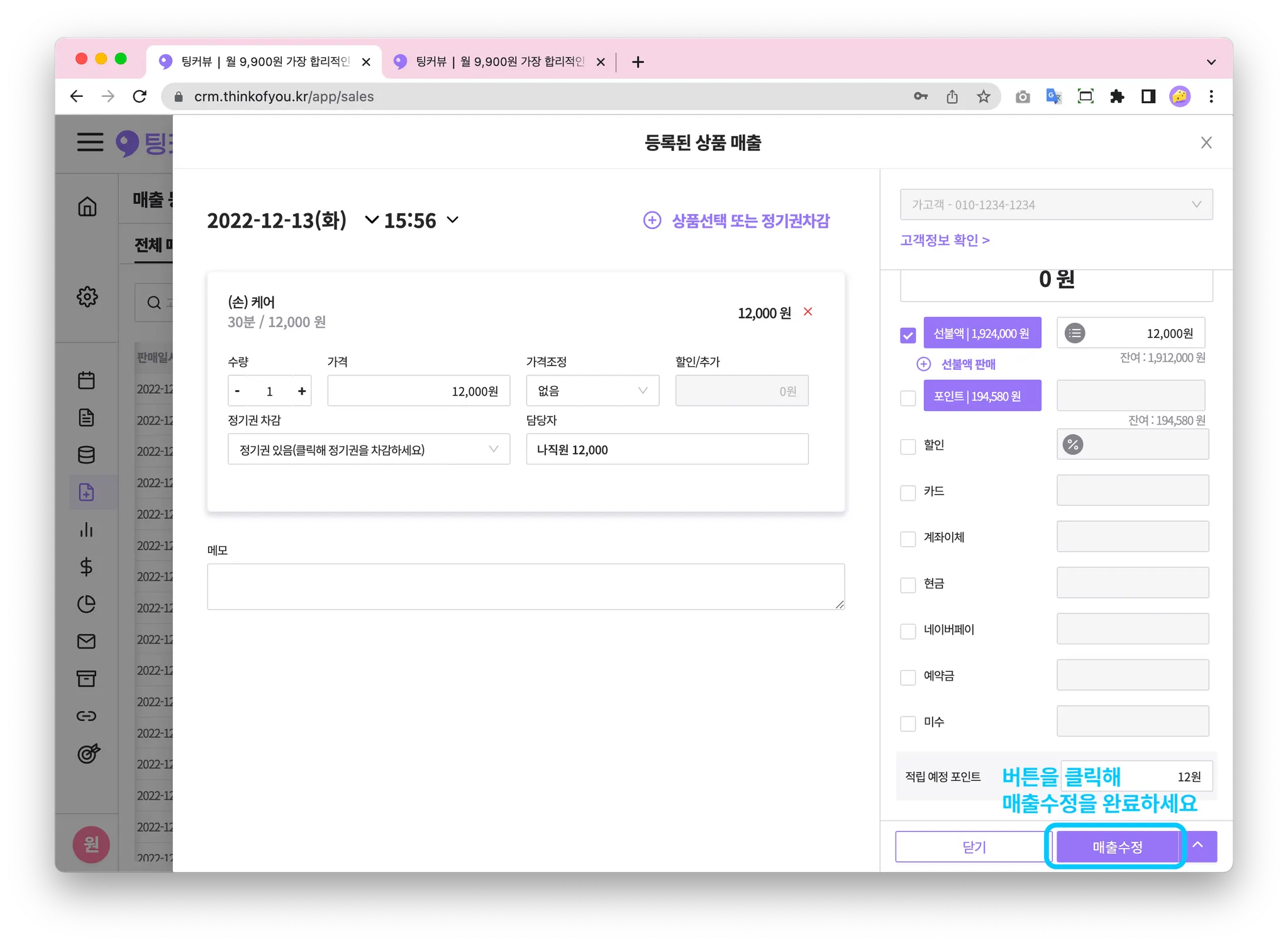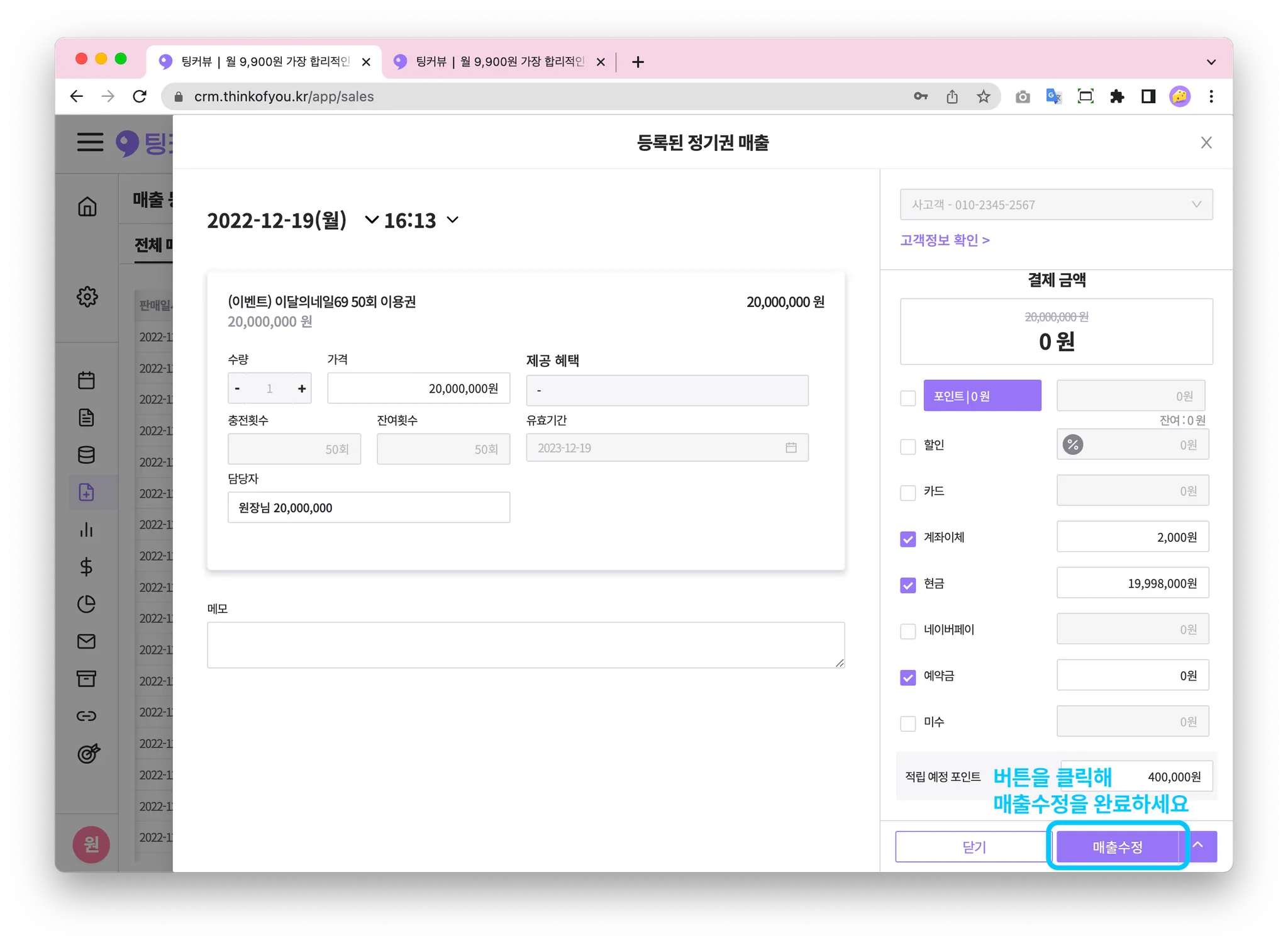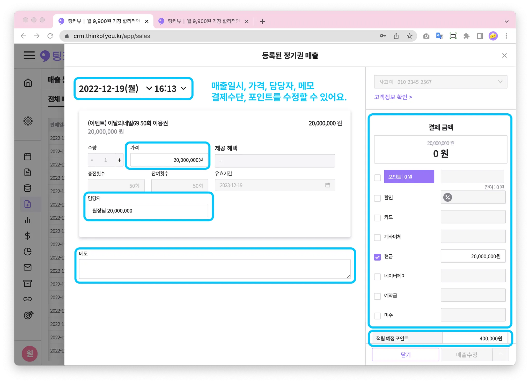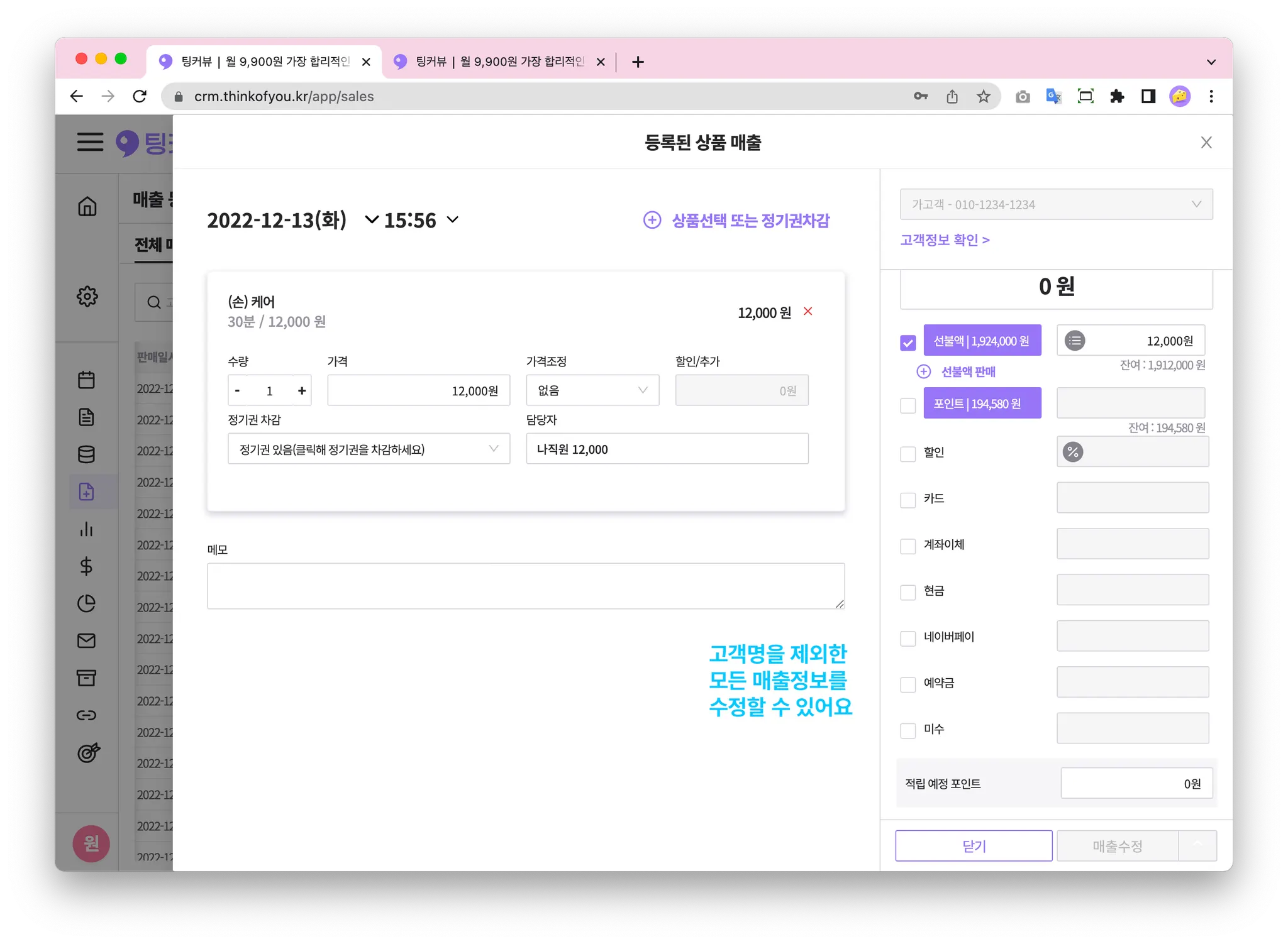 매출일시, 가격, 담당자, 메모, 결제수단, 포인트를 수정할 수 있습니다.