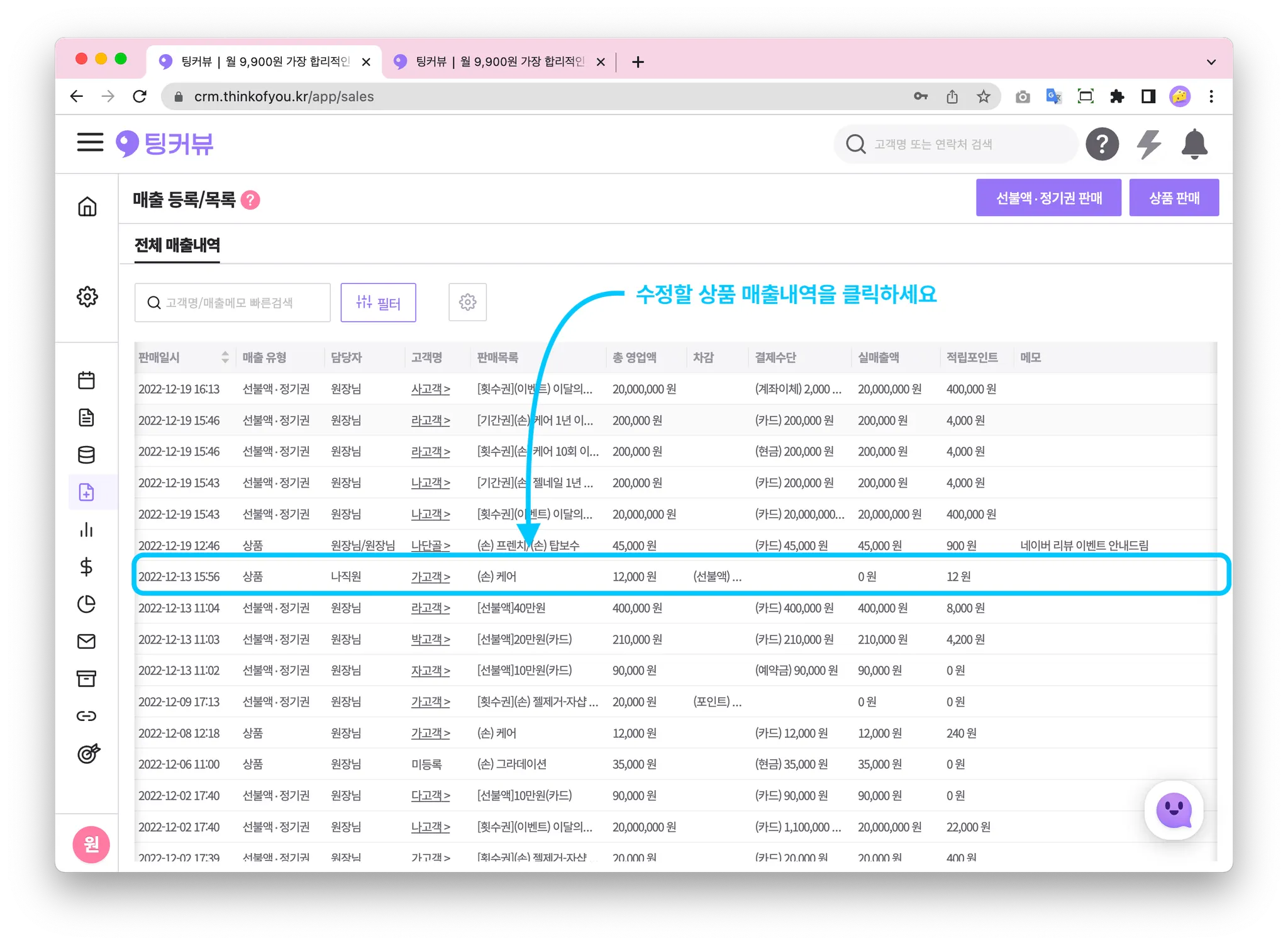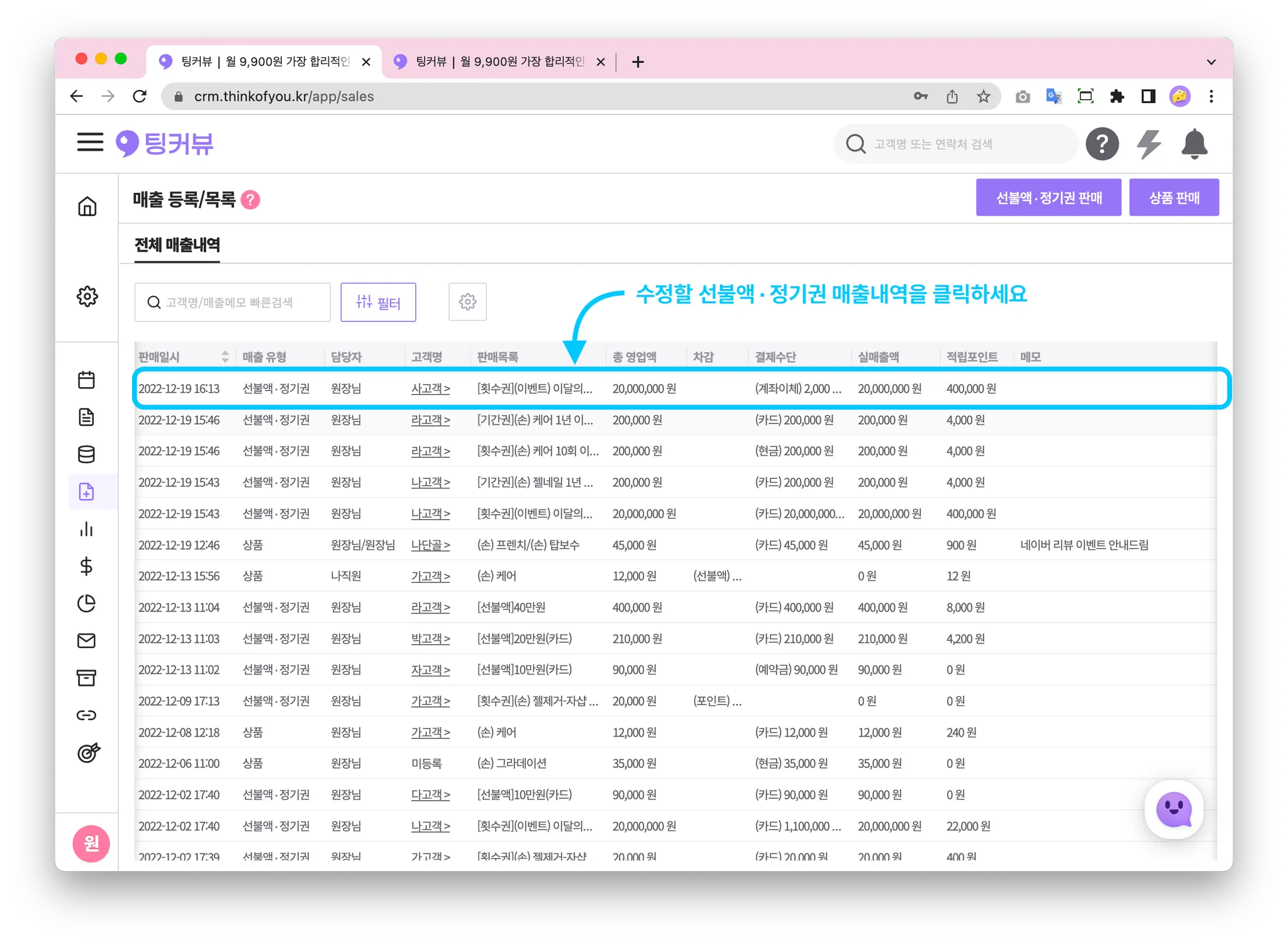 수정할 선불액∙정기권 매출내역을 클릭하세요.