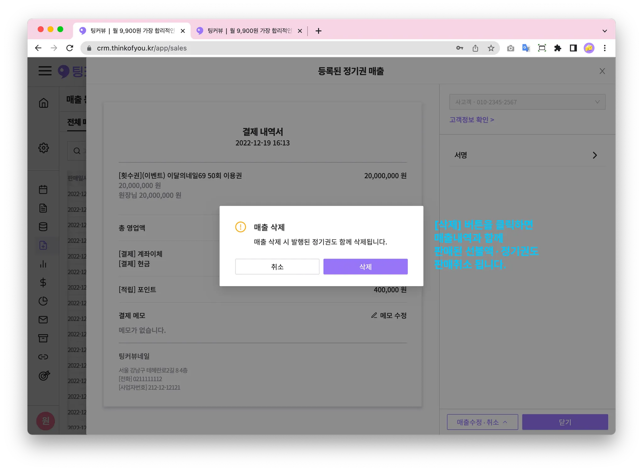 팝업의 [삭제]버튼을 클릭하면 매출내역과 함께 판매된 선불액∙정기권도 판매취소 됩니다.