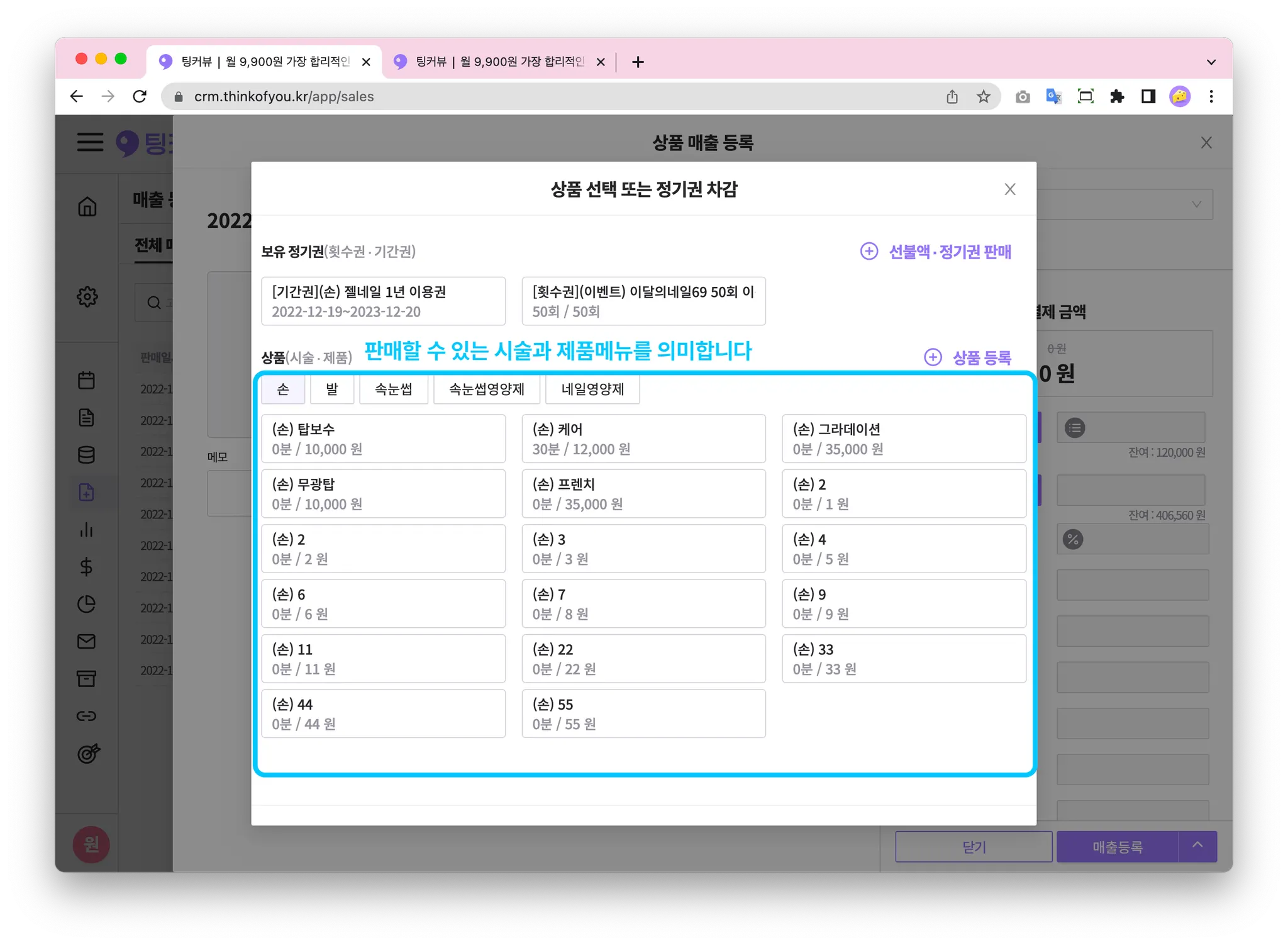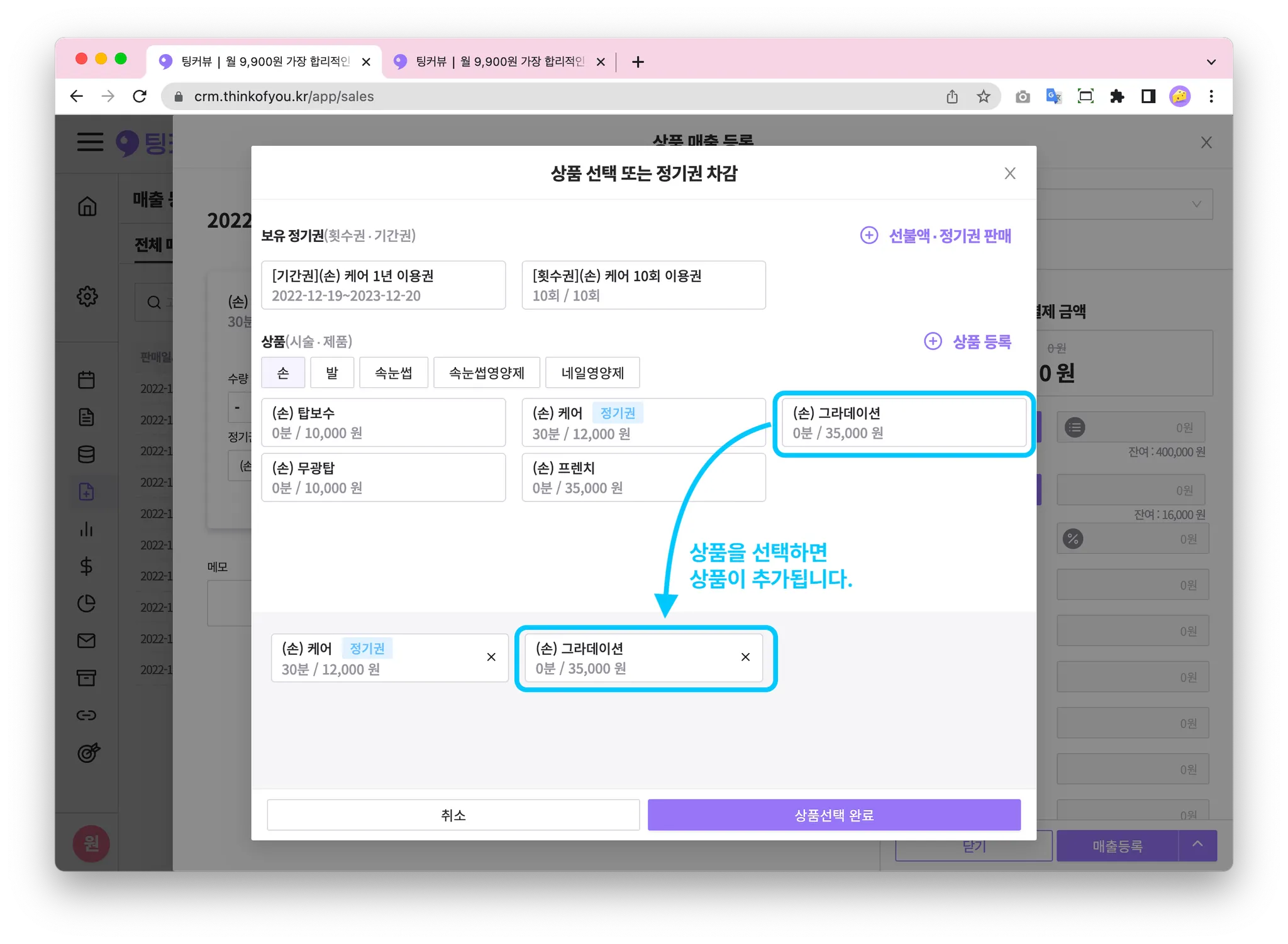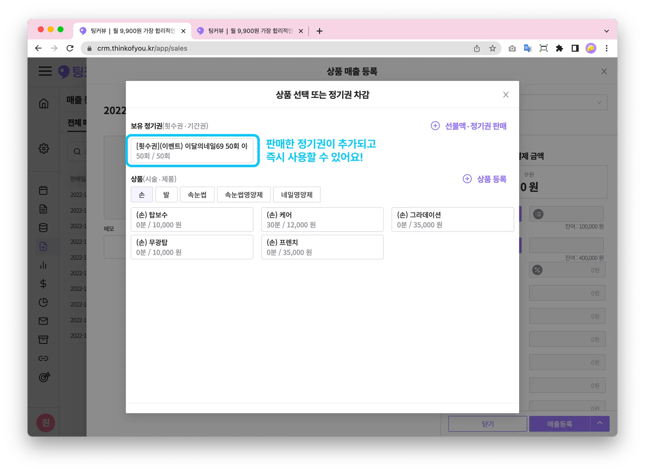 고객이 방문해 시술을 마쳤다면? 결제를 할 차례죠! 상품판매하기 기능을 이용하면 고객에게 시술과 제품을 판매하고 매출등록할 수 있어요