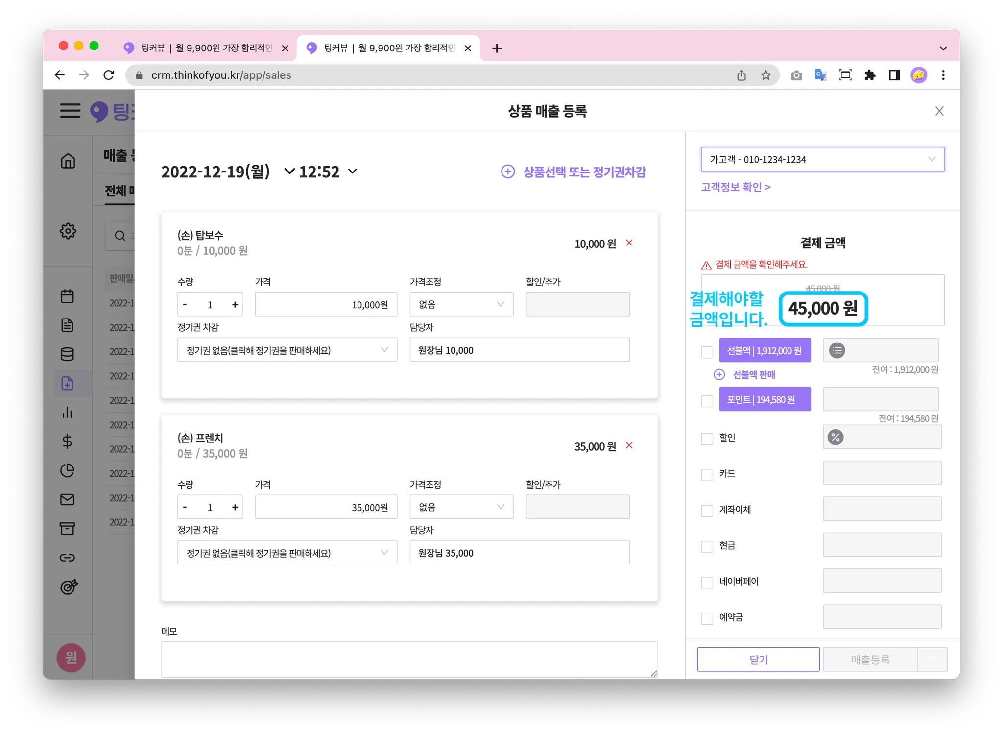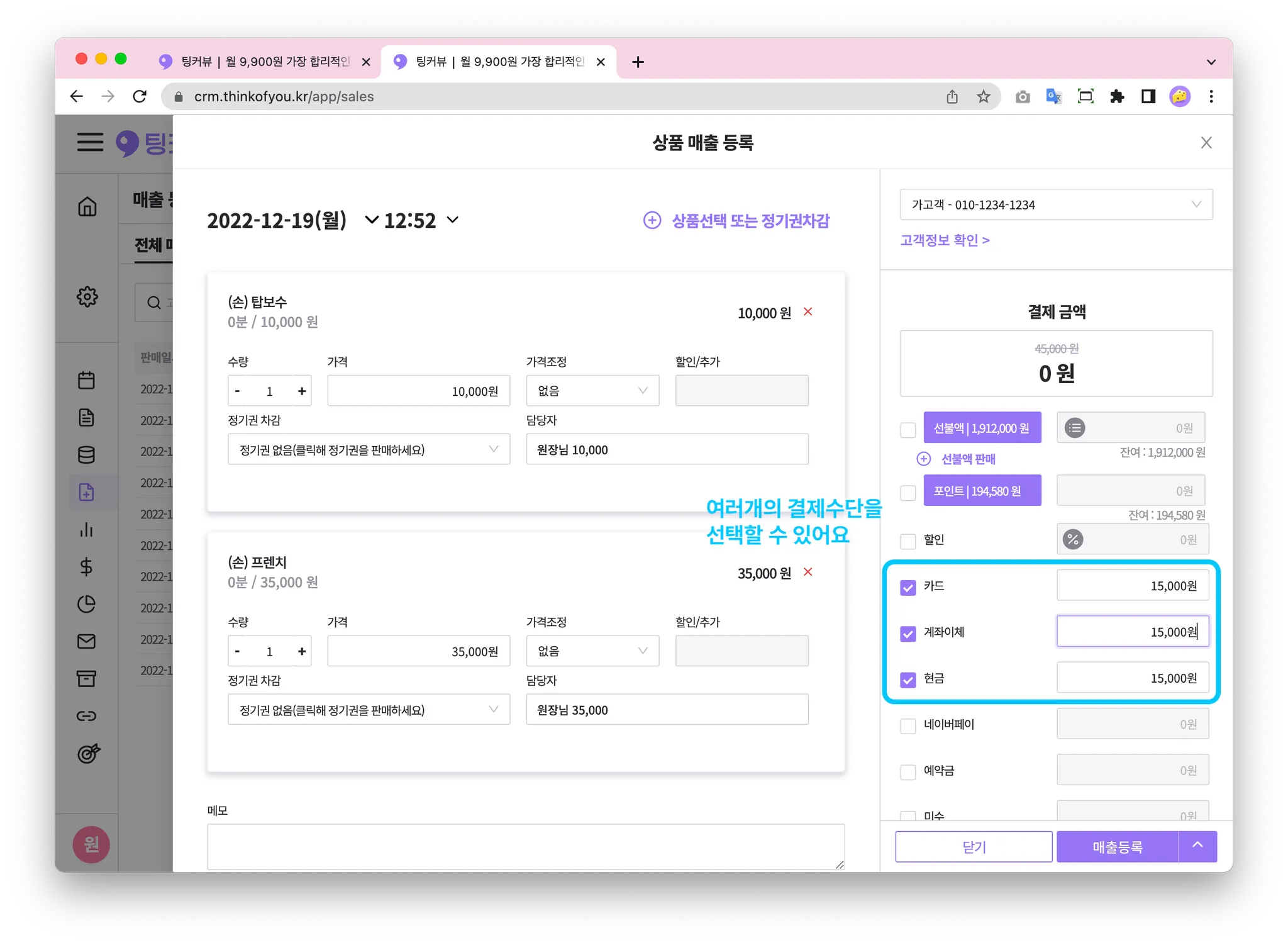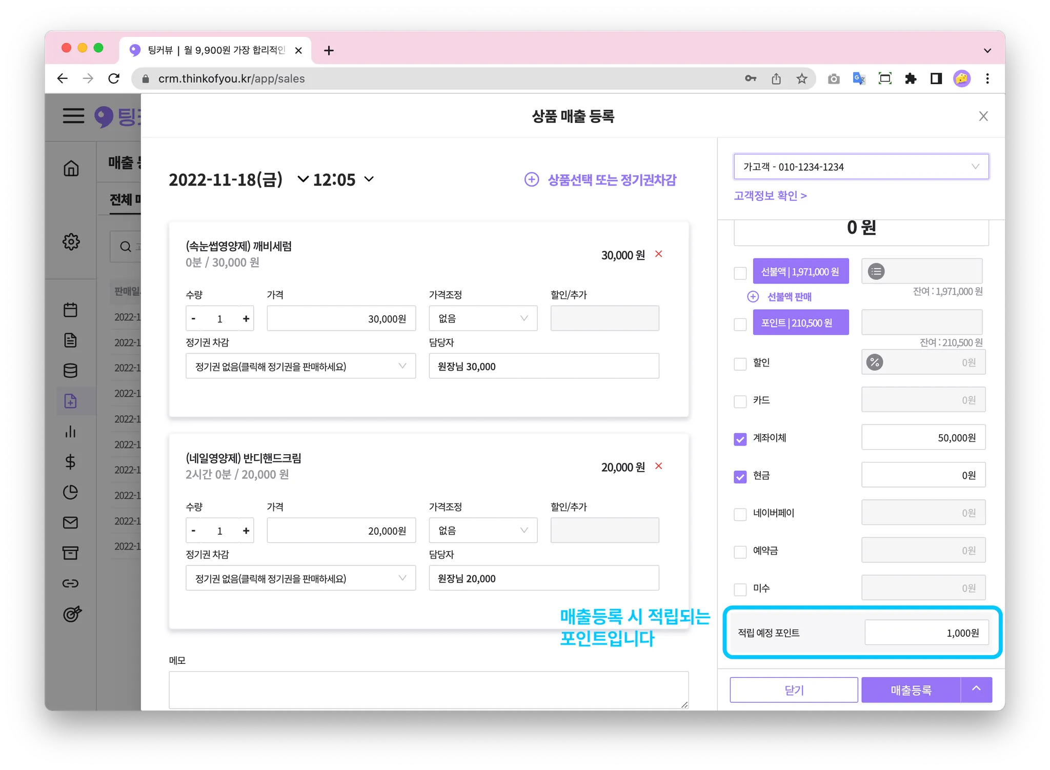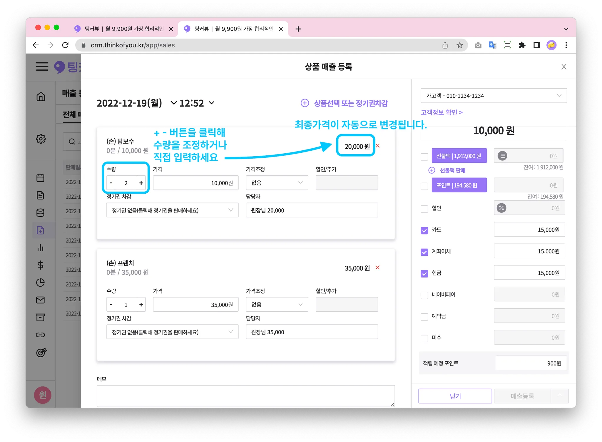 고객이 방문해 시술을 마쳤다면? 결제를 할 차례죠! 상품판매하기 기능을 이용하면 고객에게 시술과 제품을 판매하고 매출등록할 수 있어요
