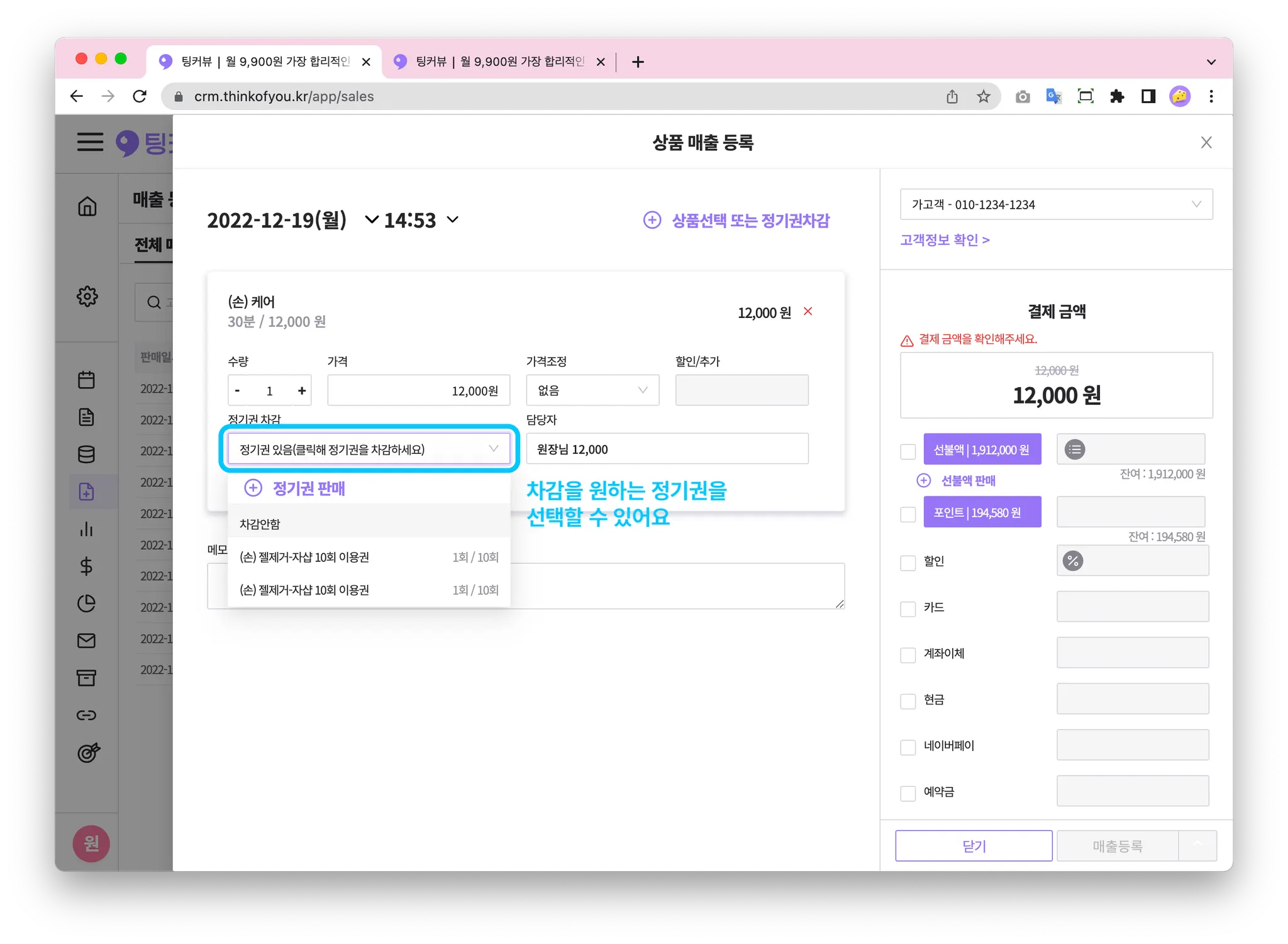 동일한 고객명을 입력하고 정기권을 판매하세요!