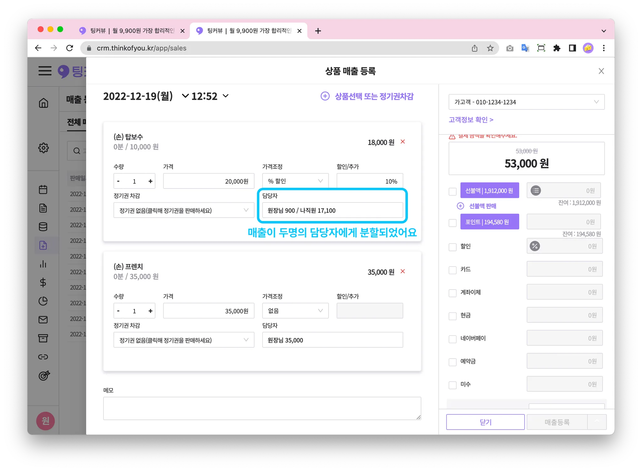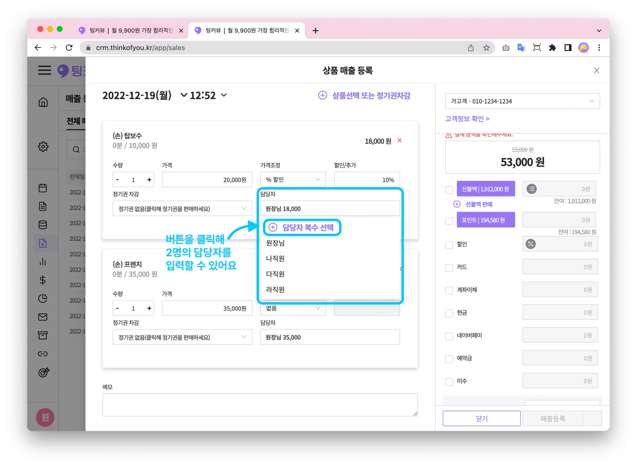 하나의 상품에 여러명의 담당자가 있을 땐, 담당자복수 선택 기능을 이용해보세요! 매출금액을 분할해 집계할 수 있어요!