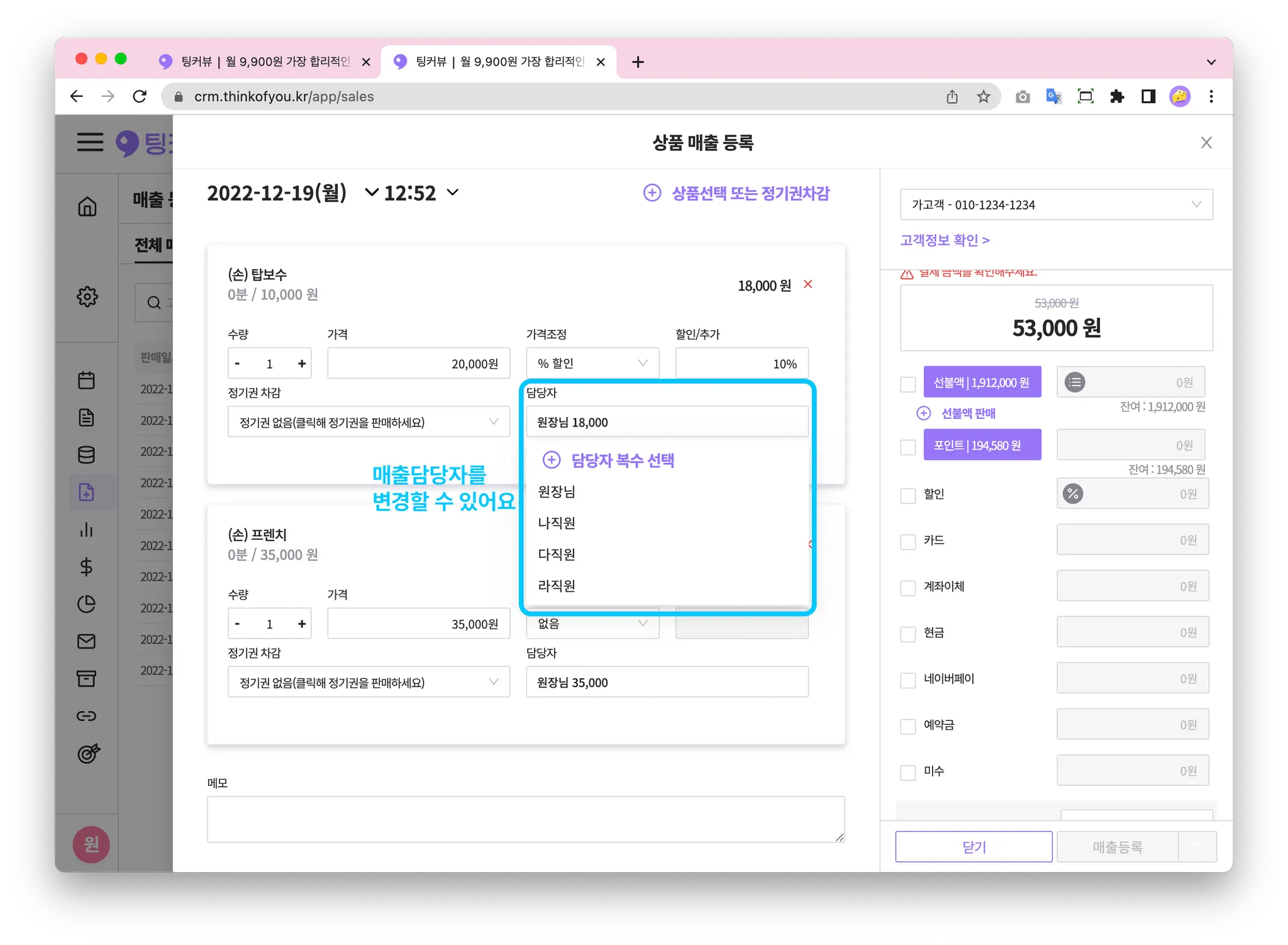 담당자를 클릭해 다른 담당자로 변경할 수 있어요! 이 때 선택한 담당자앞으로 매출과 인센티브 금액이 집계됩니다.
