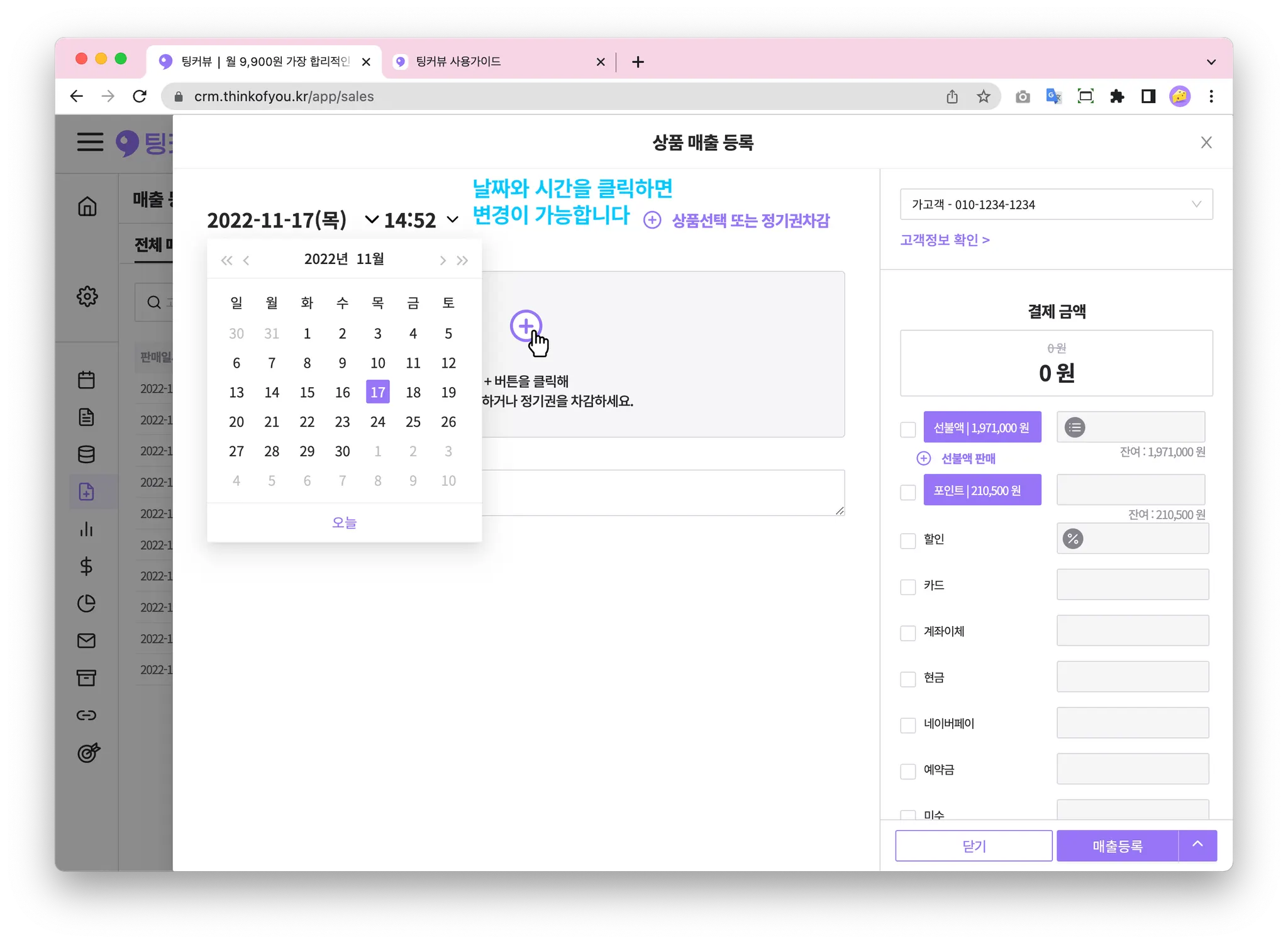 매출일시는 현재시간을 기본으로 세팅되어 있어요! 좌측상단의 타임피커를 클릭해 원하는 날짜와 시간을 선택하면 매출일시가 변경됩니다