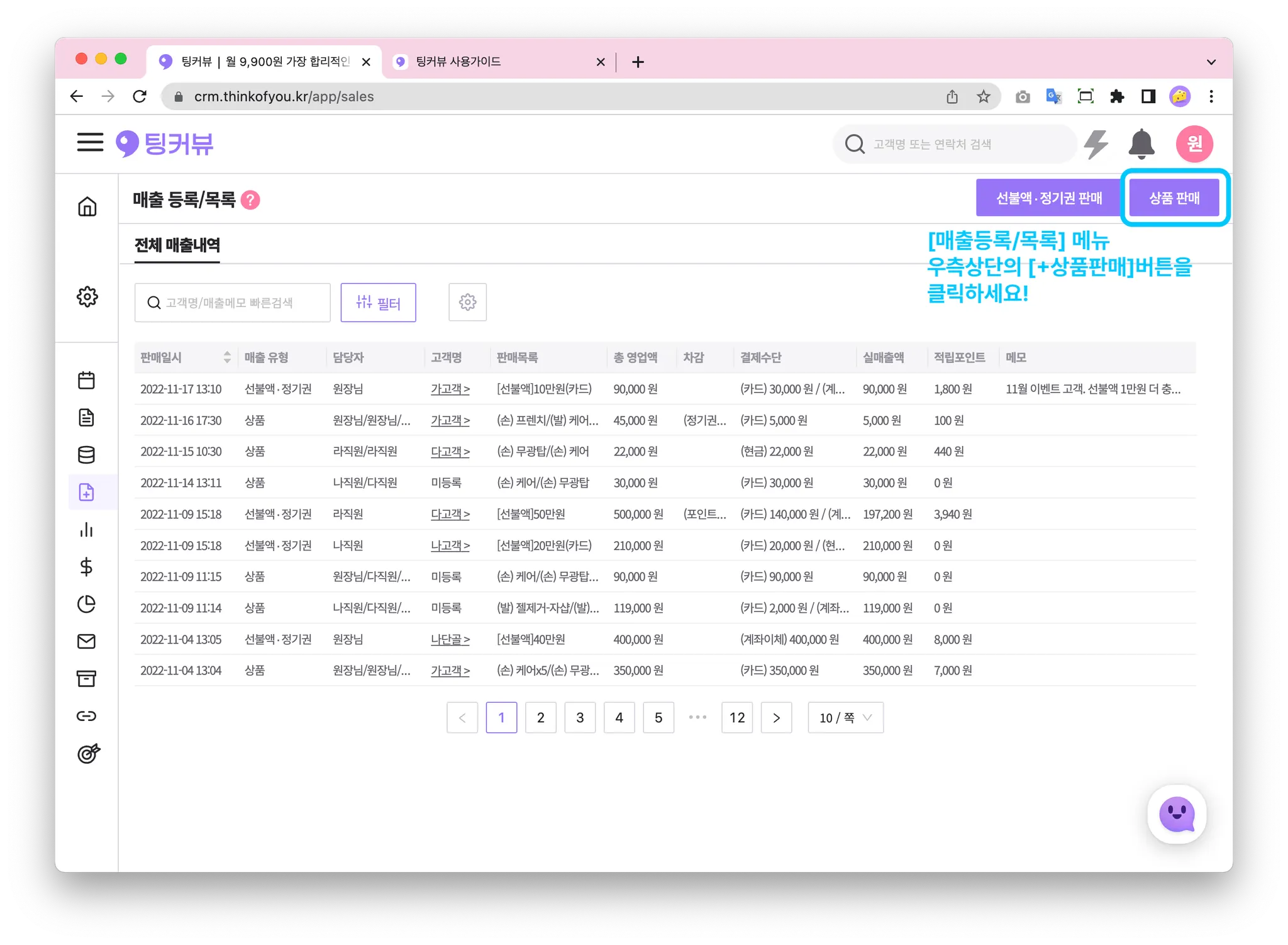 매출등록/목록 메뉴 우측상단의 [+ 상품판매]버튼을 클릭하세요!