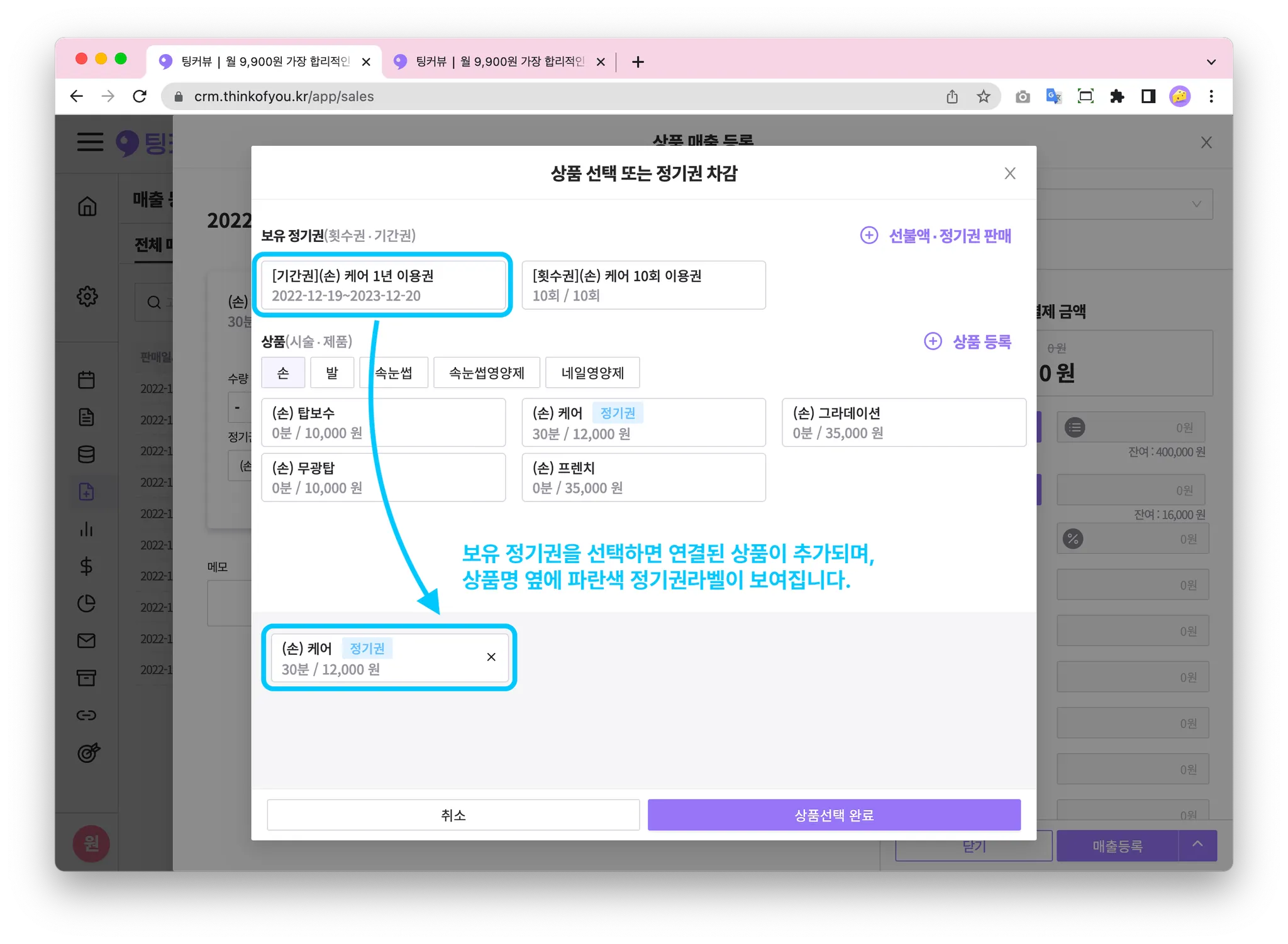 우측 상단의 [+ 상품선택 또는 정기권차감] 버튼을 클릭하면 고객이 보유한 정기권과 판매가능한 상품메뉴를 확인할 수 있어요