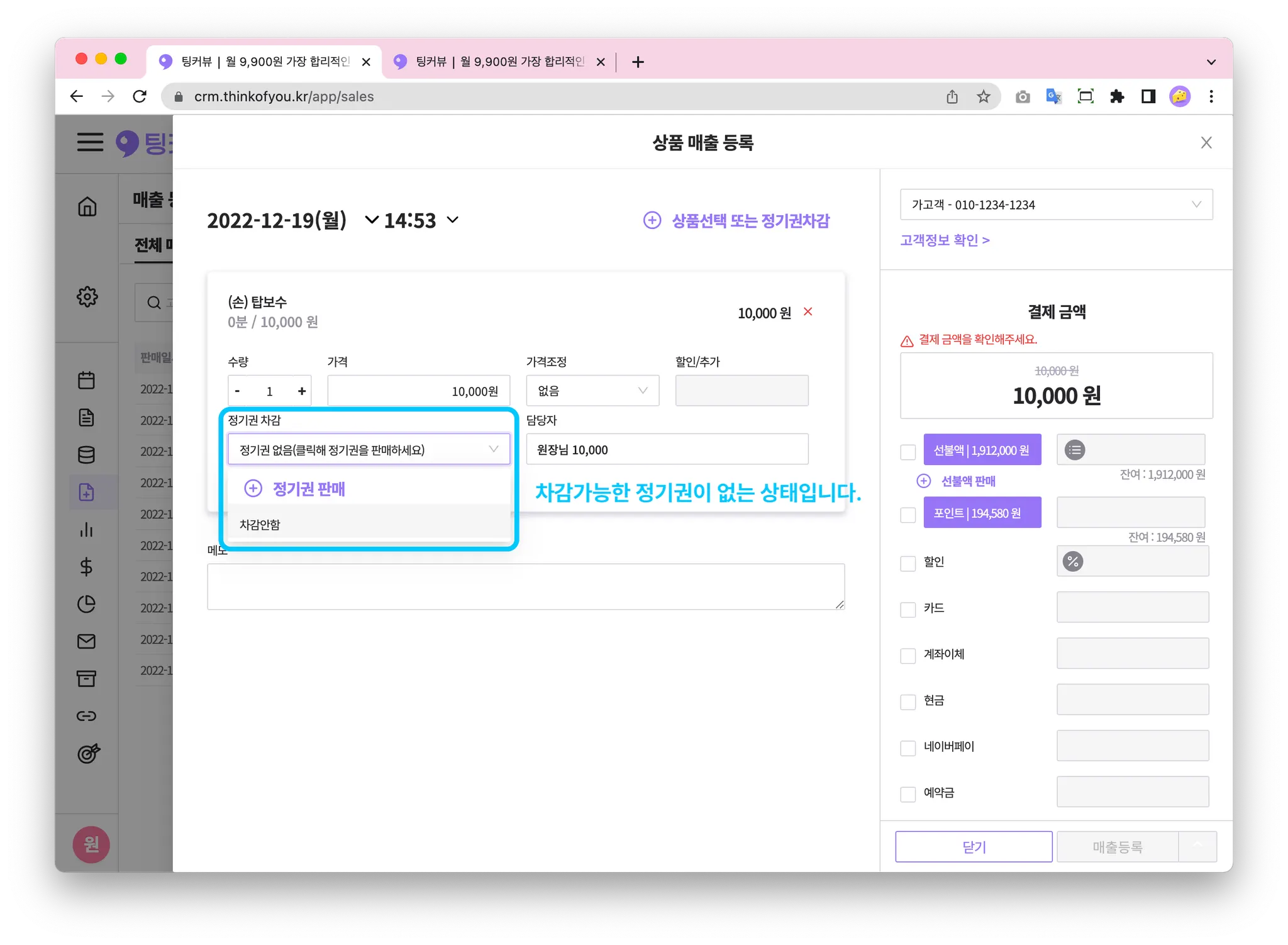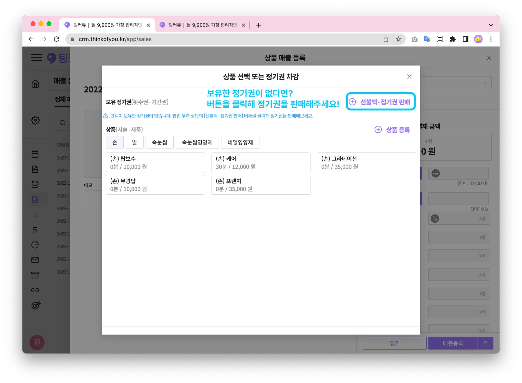 고객이 보유한 정기권이 없는데, 정기권으로 상품을 결제하고 싶어한다면? 먼저 정기권을 판매해주세요!