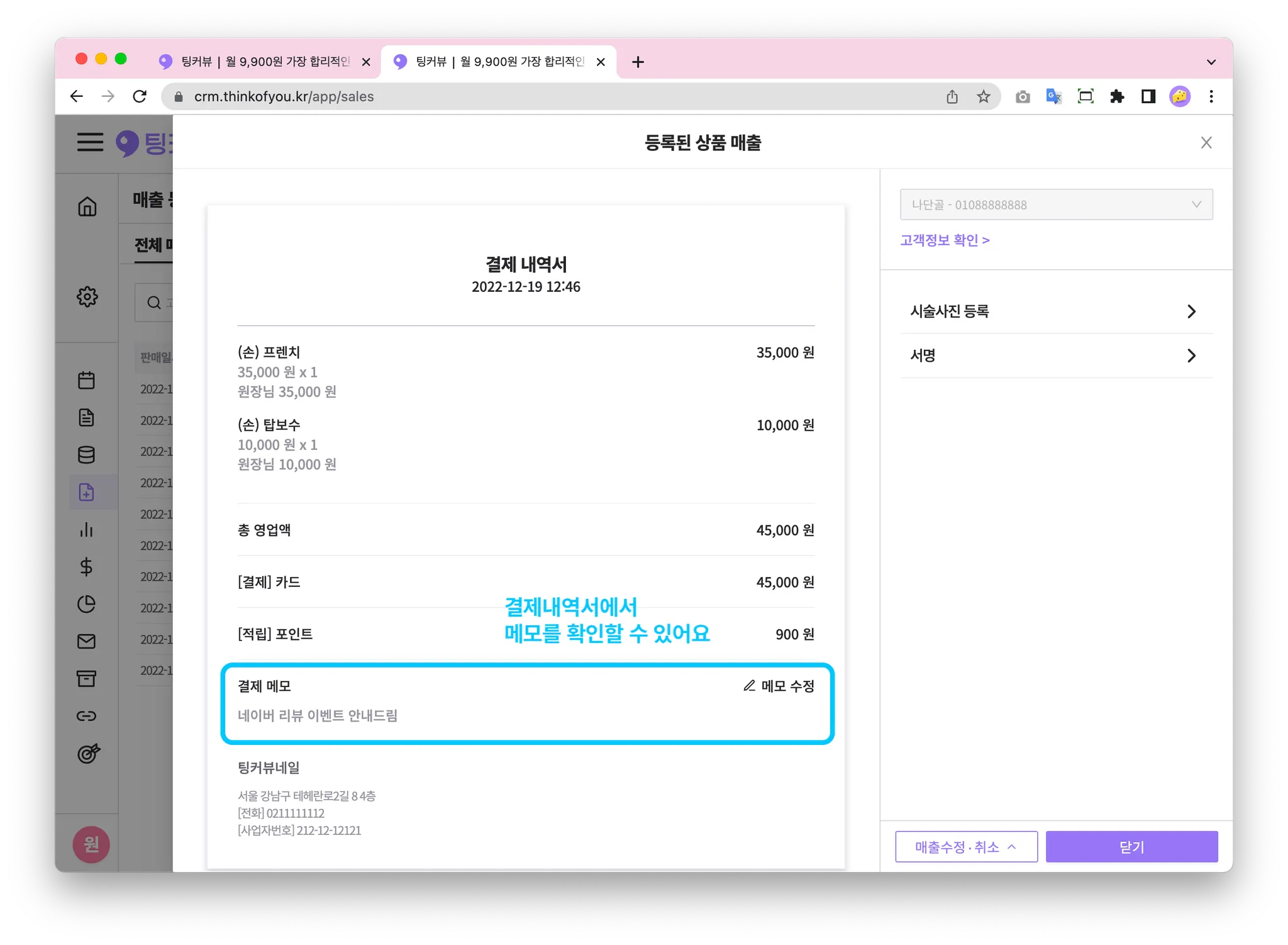 매출시점에 특이사항이 있다면? 매출메모를 기록해보세요! 입력한 매출메모는 매출내역과 결제내역서에서도 함께 확인할 수 있어요!
