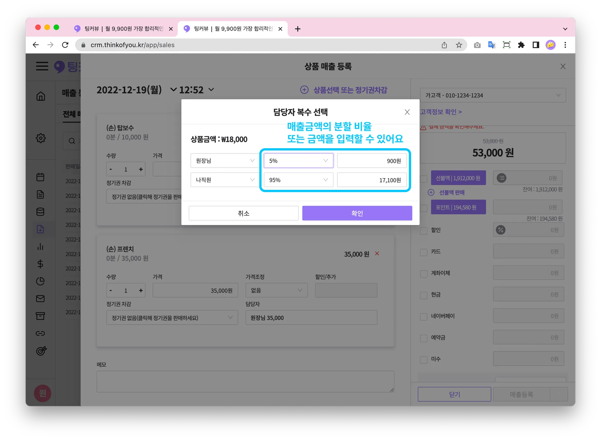 두명의 담당자를 클릭하고 할당률 또는 금액을 입력한 후 [확인]버튼을 클릭하세요!