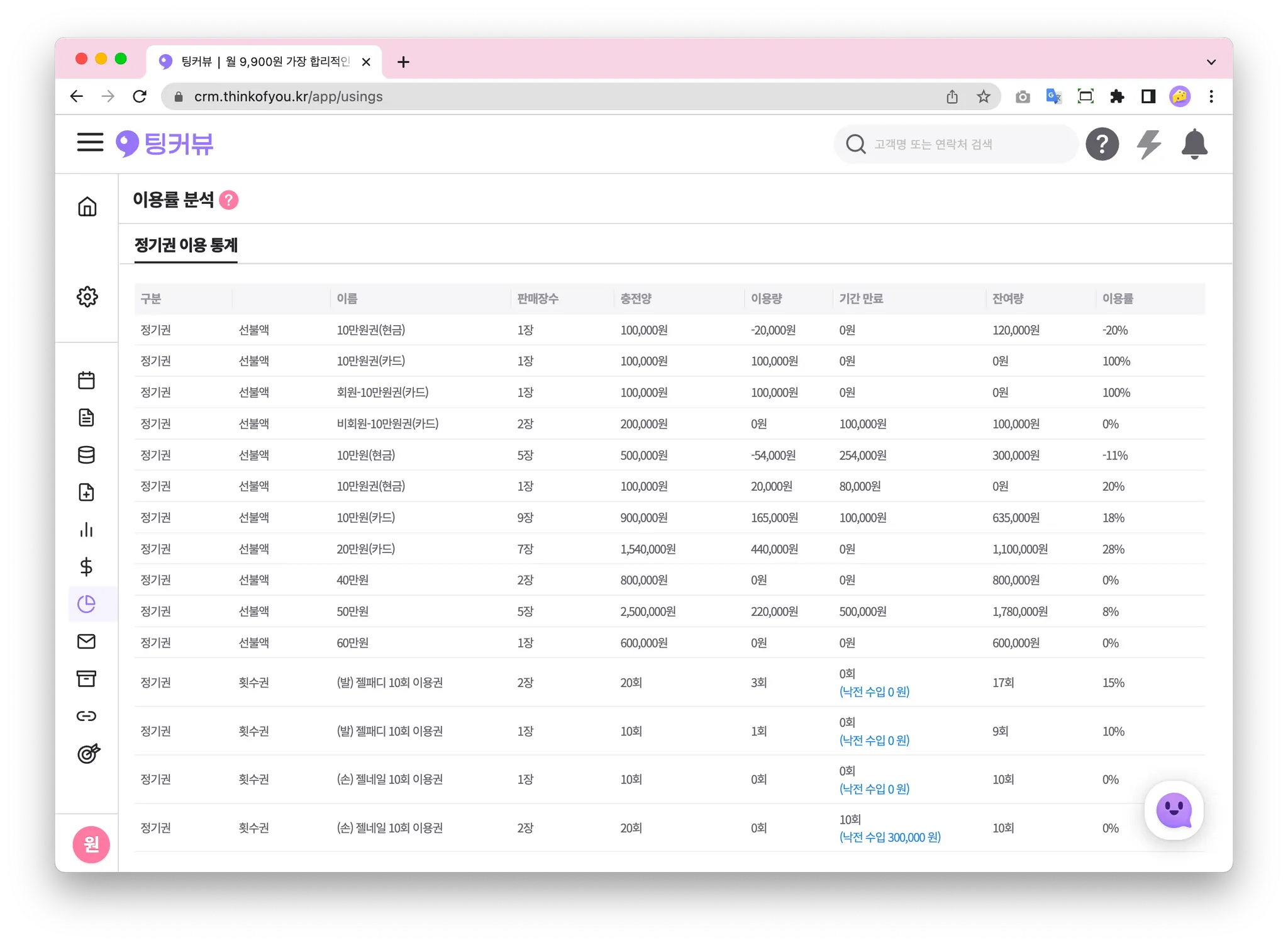 고객에게 판매한 선불액과 정기권을 어느정도 소진했는지 확인하고 싶다면? 이용률 분석 메뉴를 이용해보세요