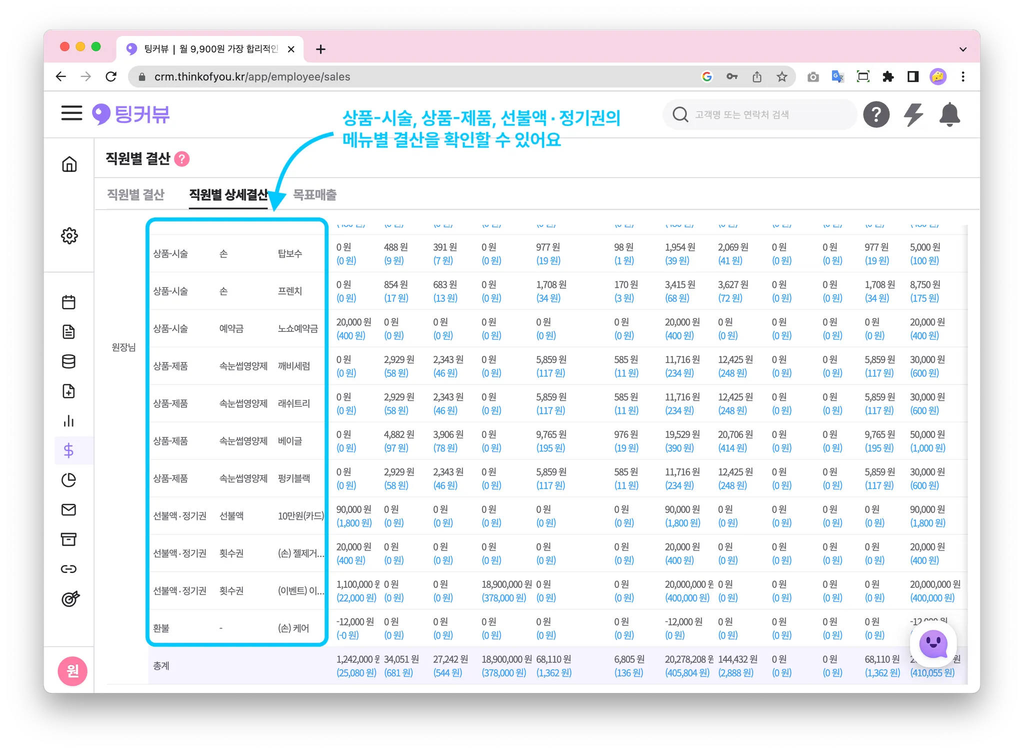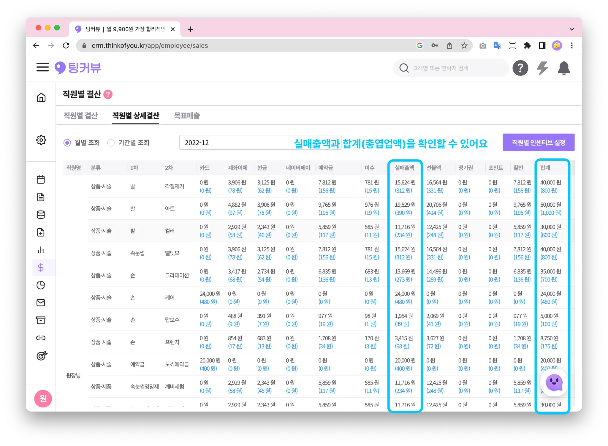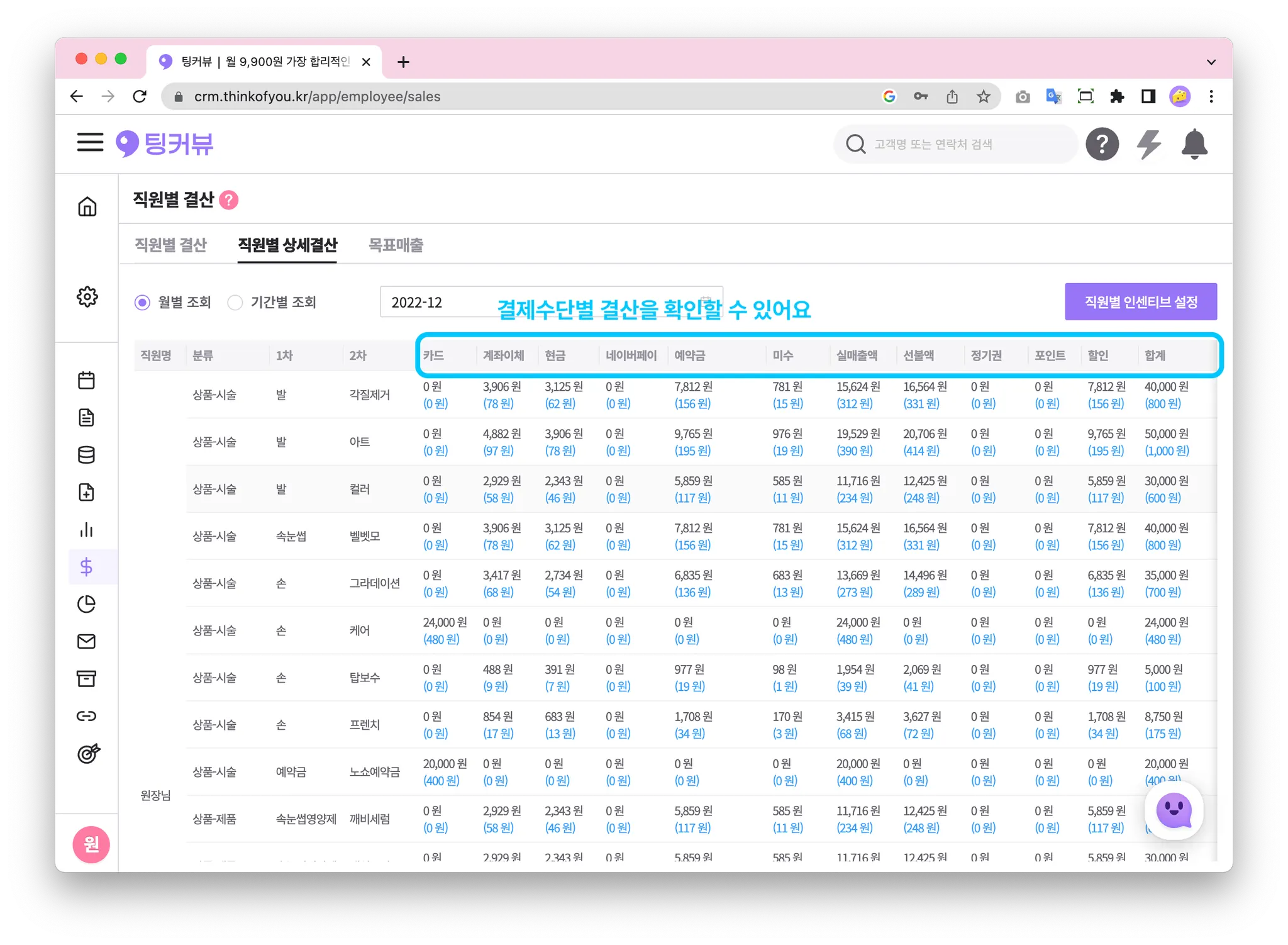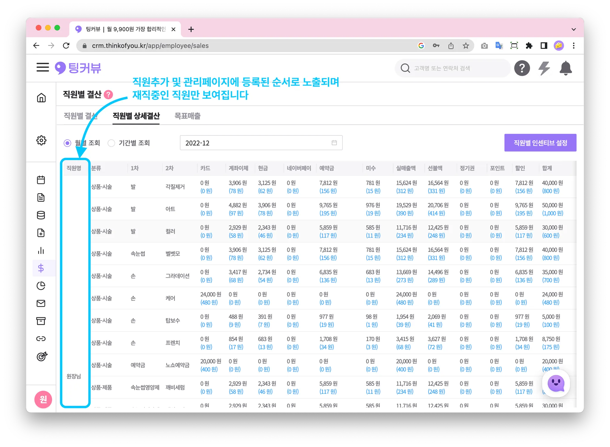 직원별로 어떤 품목을 판매했는지 상세하게 확인하고 싶다면? 직원별 상세결산 페이지를 이용해보세요!