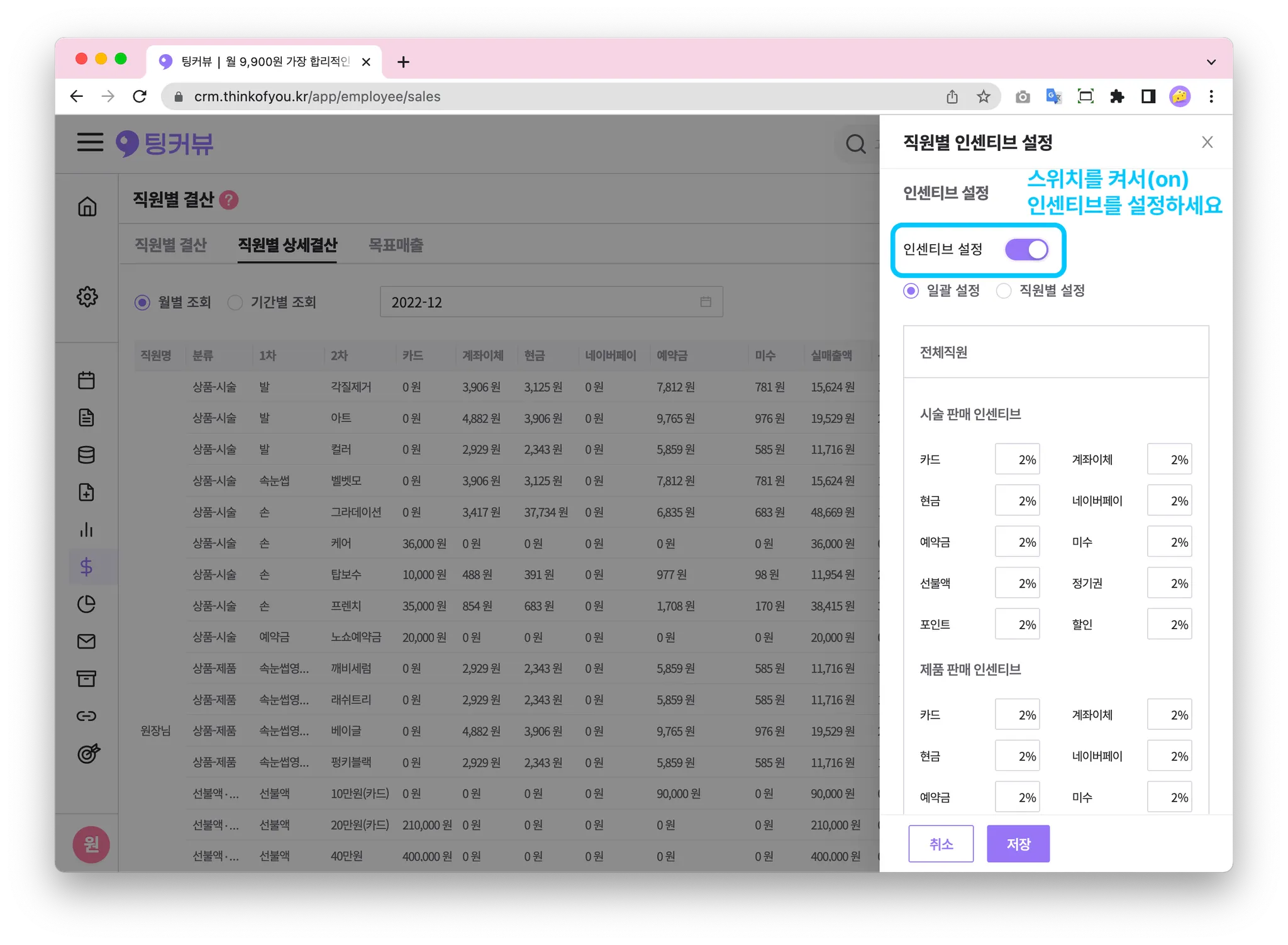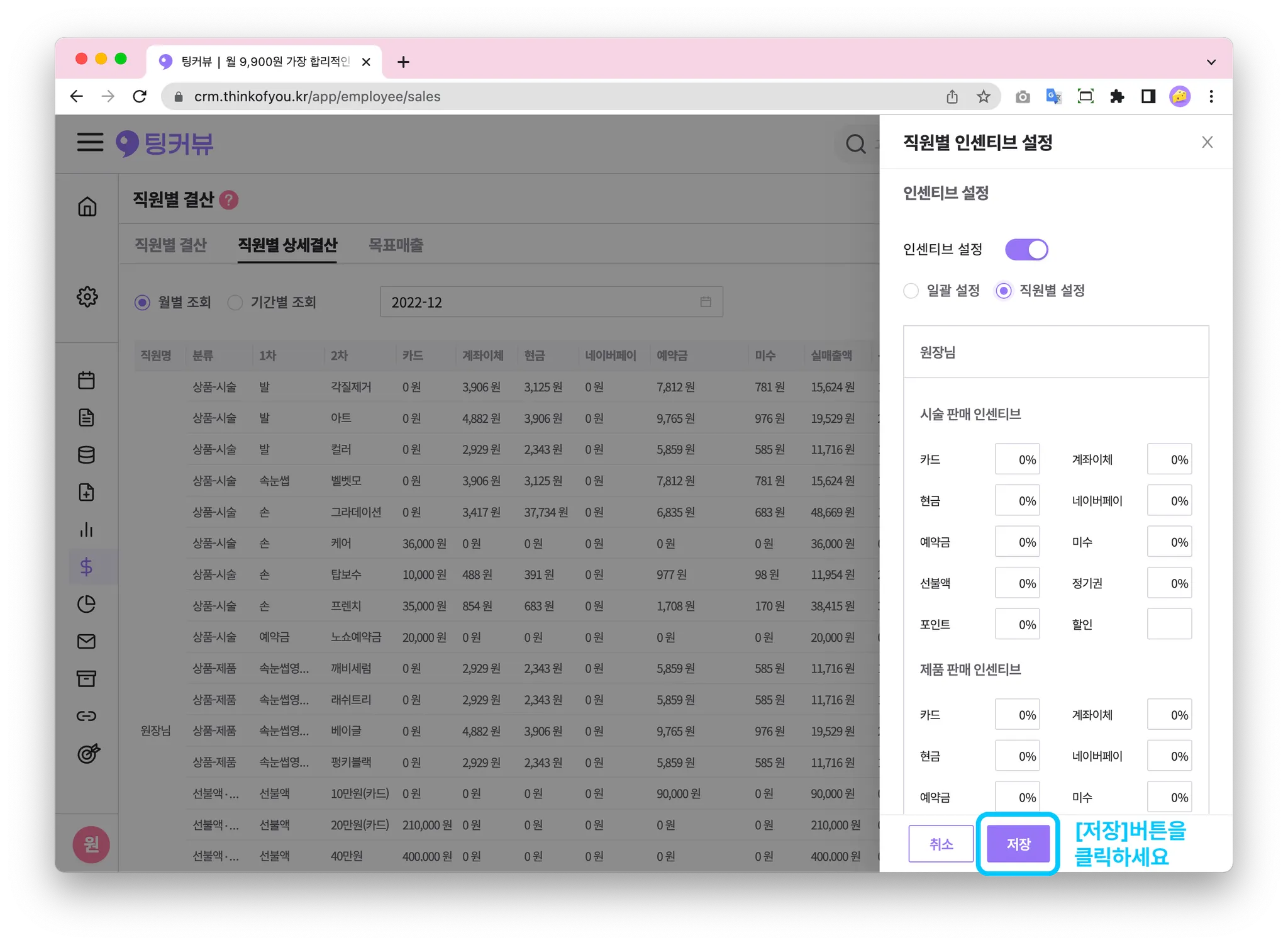 우측의 [직원별 인센티브 설정]버튼을 클릭하세요