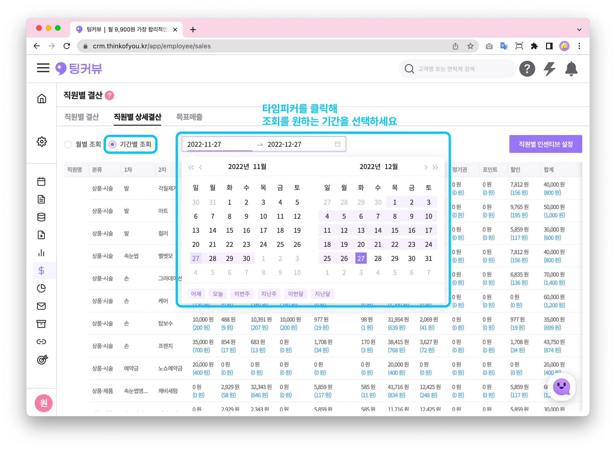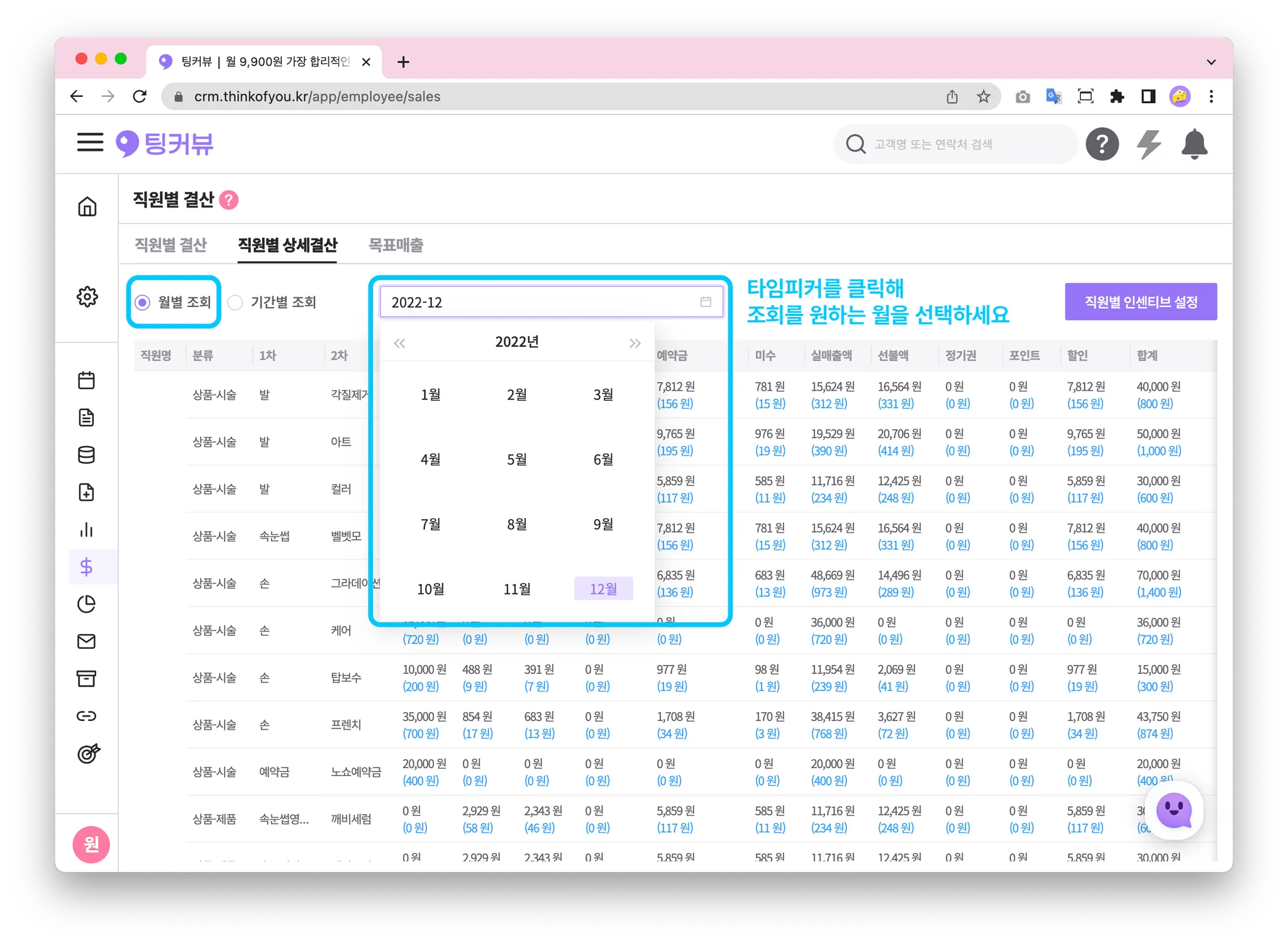 이번 달이 아닌 다른 달의 결산금액을 확인하고 싶다면 타임피커를 클릭해 조회를 원하는 년,월을 선택하세요