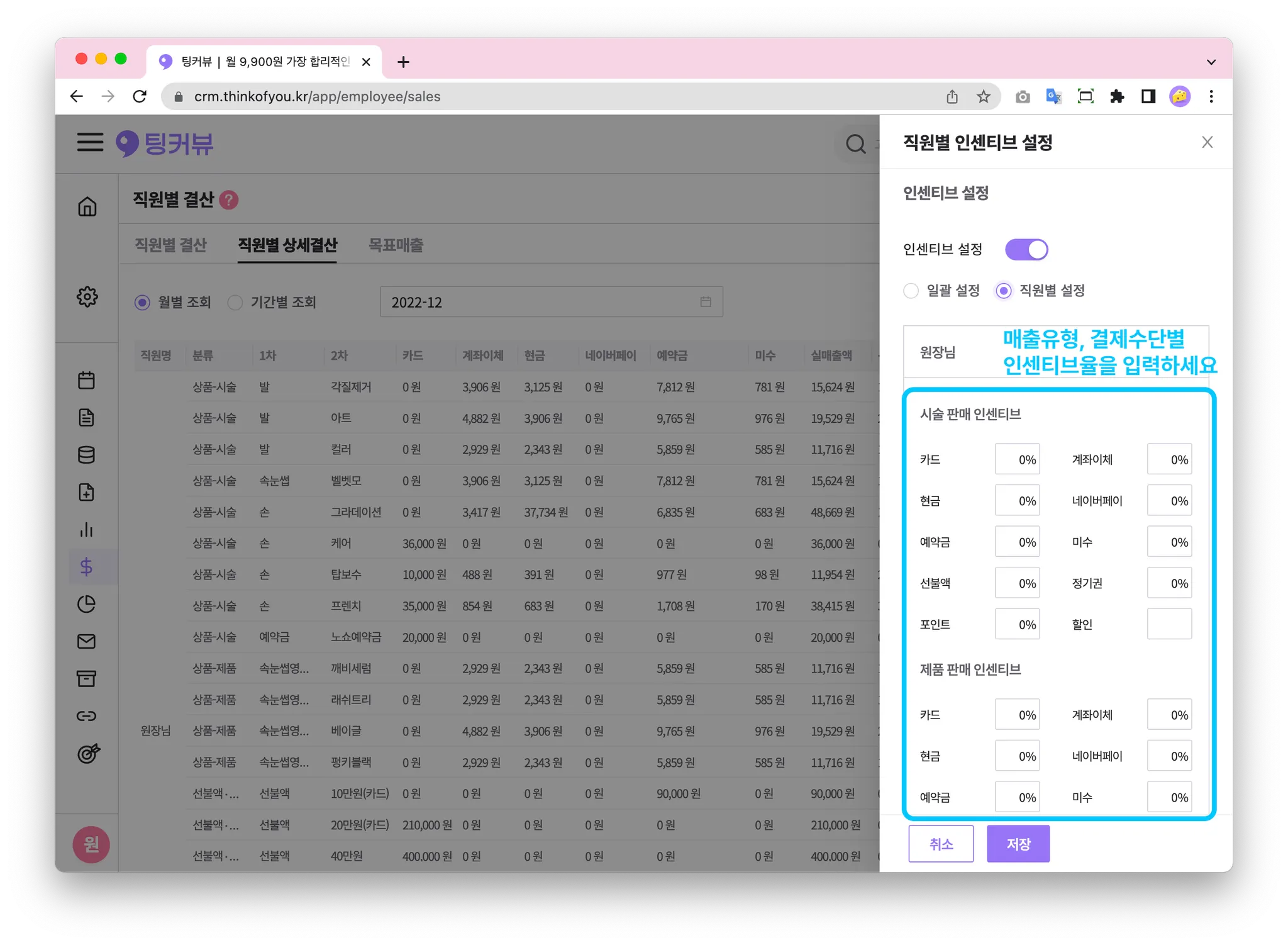 매출유형∙결제수단별 인센티브율을 입력하세요