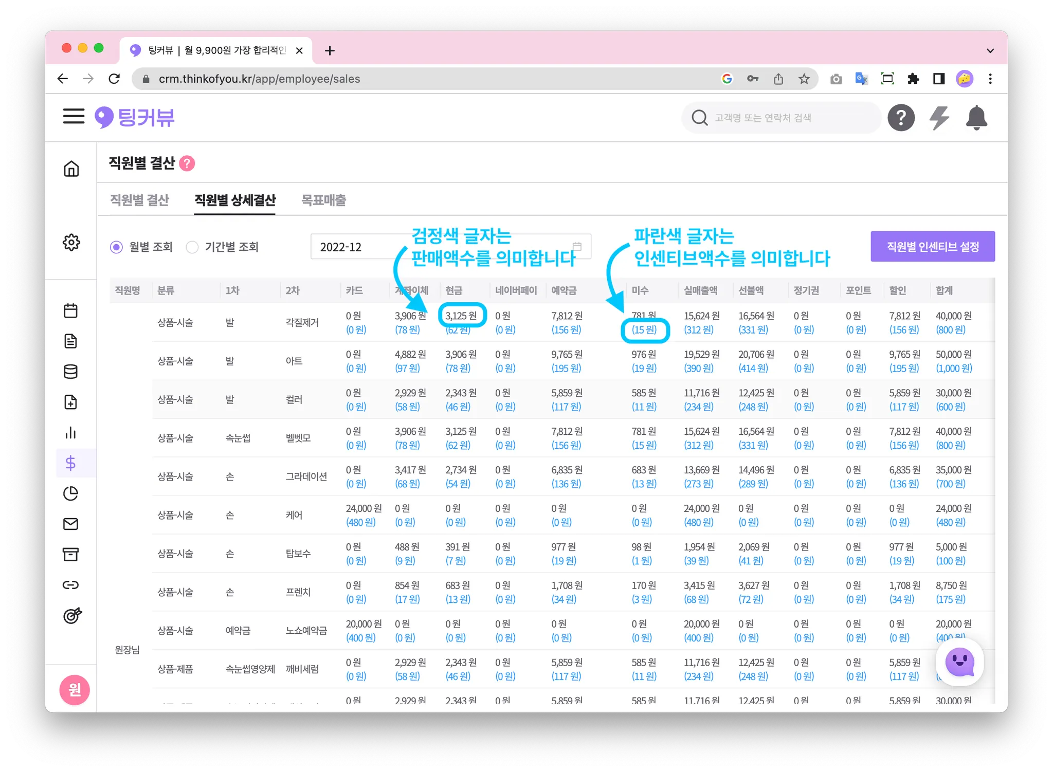 표안의 검정색 글자는 판매액수, 파란색 글자는 인센티브 액수를 의미합니다.