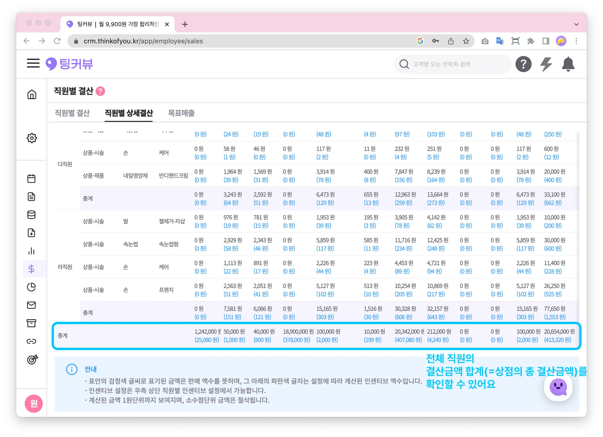 전체 직원의 결산금액 합계(=상점의 총 결산금액)를 확인할 수 있어요.