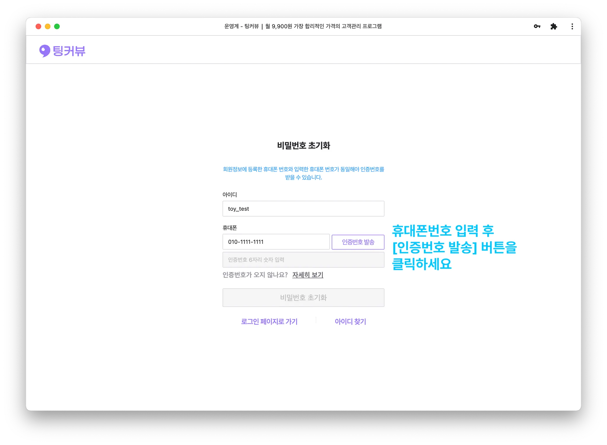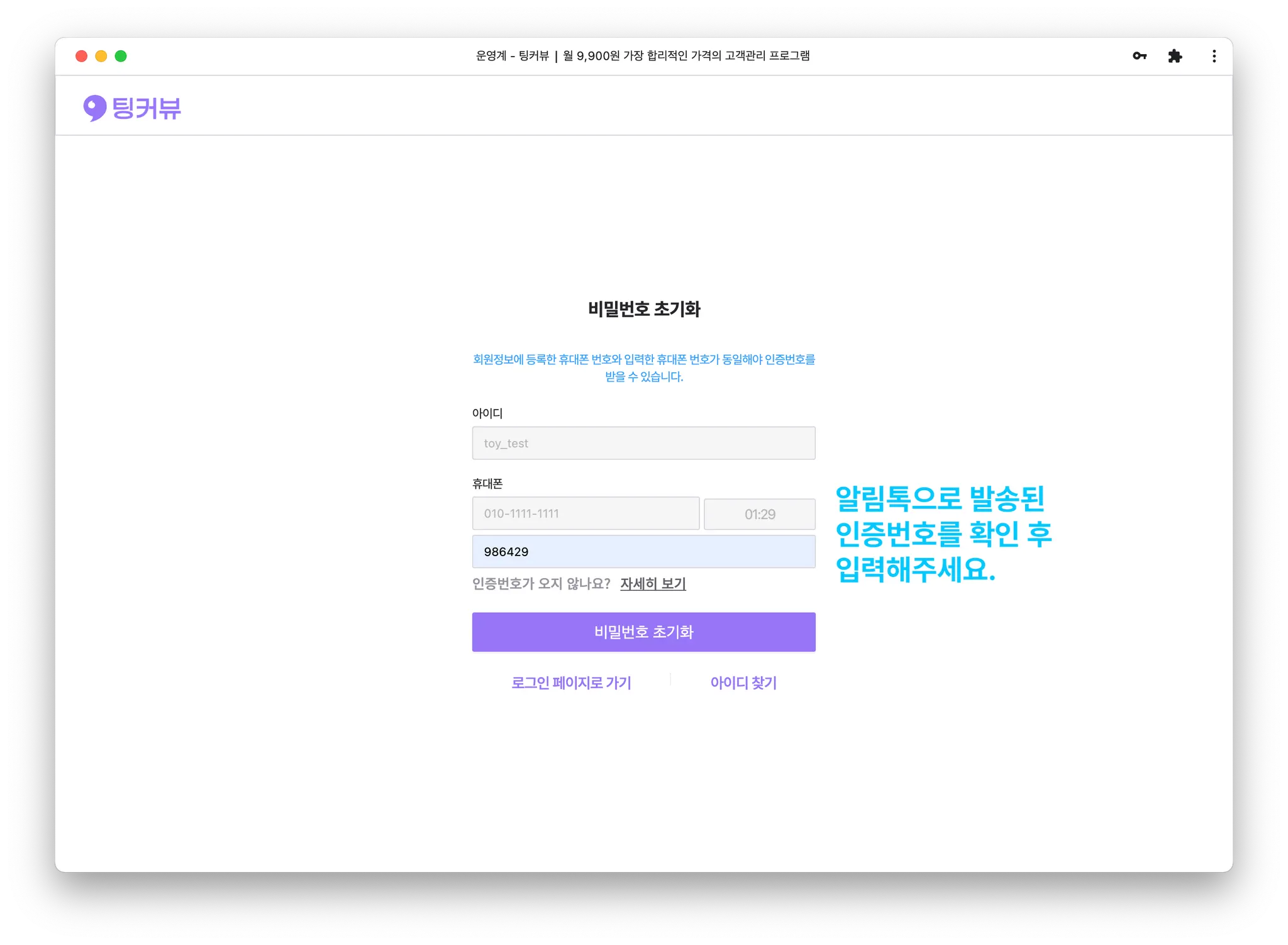 알림톡으로 발송된 인증번호를 입력 후 [비밀번호 초기화]버튼을 클릭해주세요.
