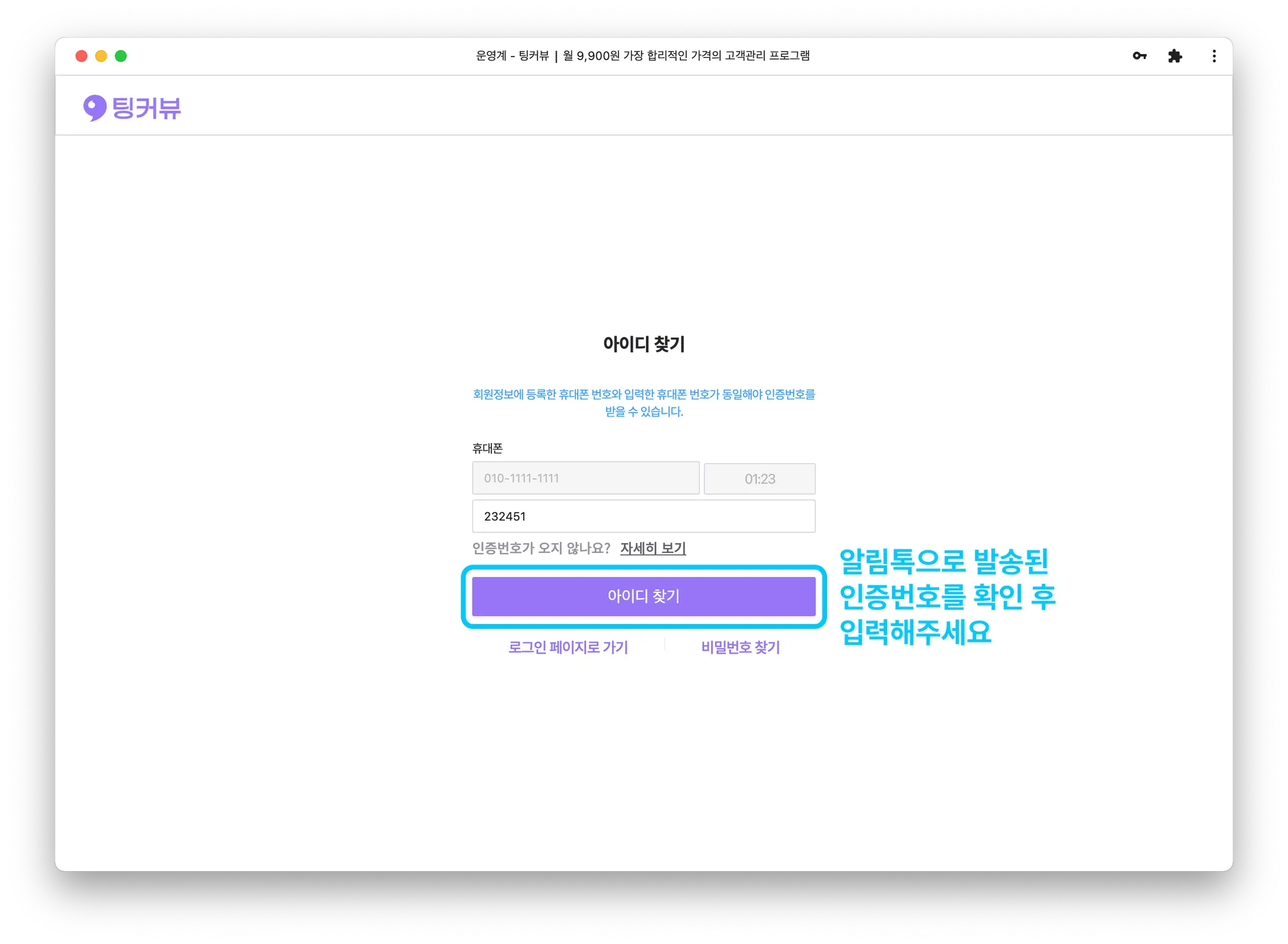알림톡으로 발송된 인증번호를 입력 후 [아이디 찾기]버튼을 클릭해주세요.