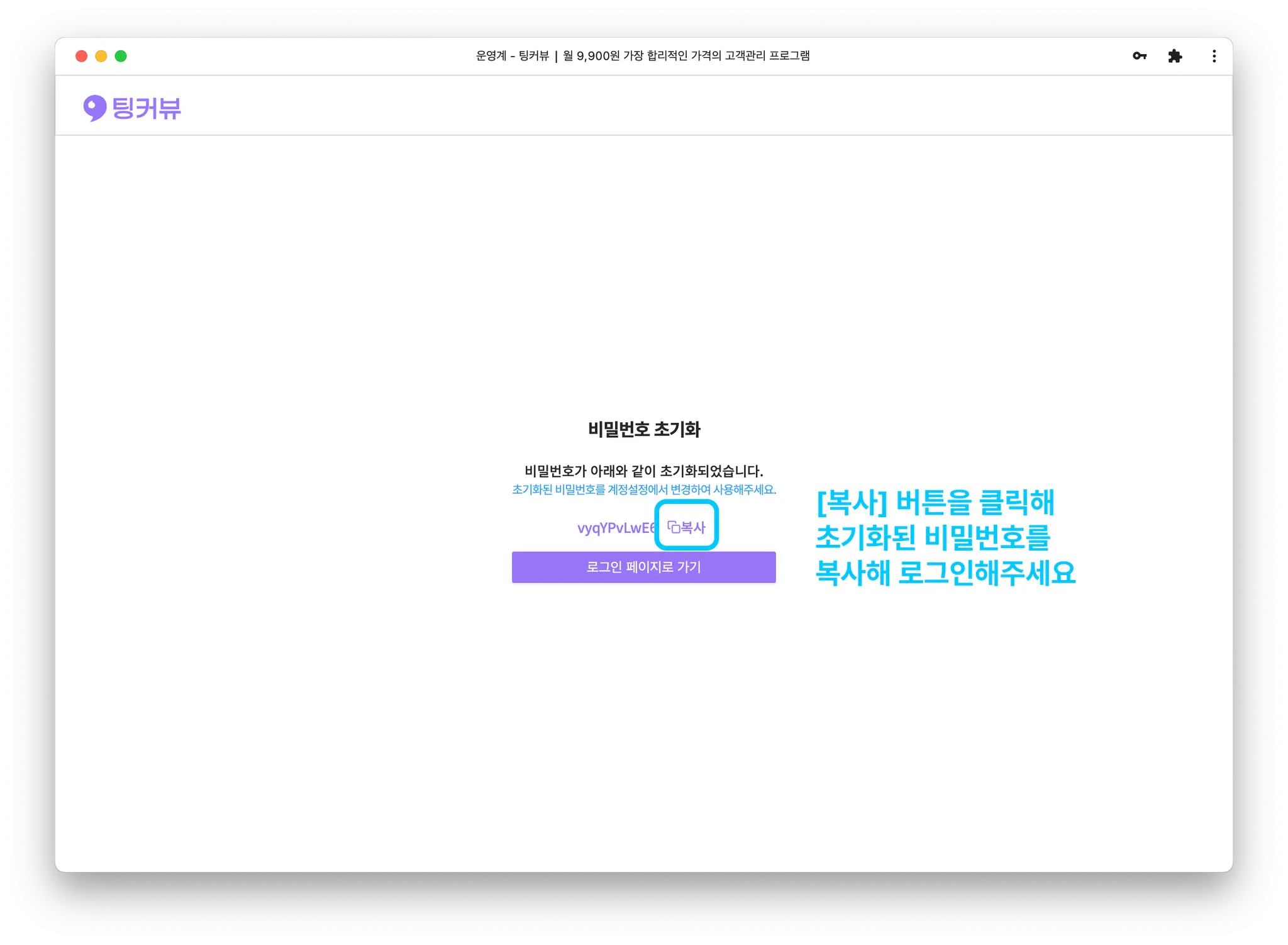 [복사]버튼을 클릭해 초기화된 비밀번호를 복사해 로그인해주세요.
