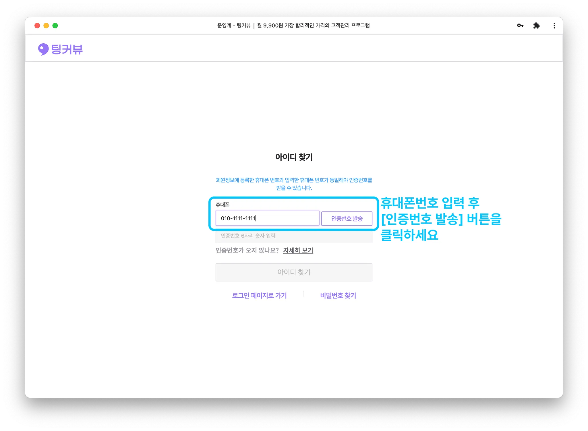 휴대폰번호 입력 후 [인증번호 발송]버튼을 클릭해주세요.