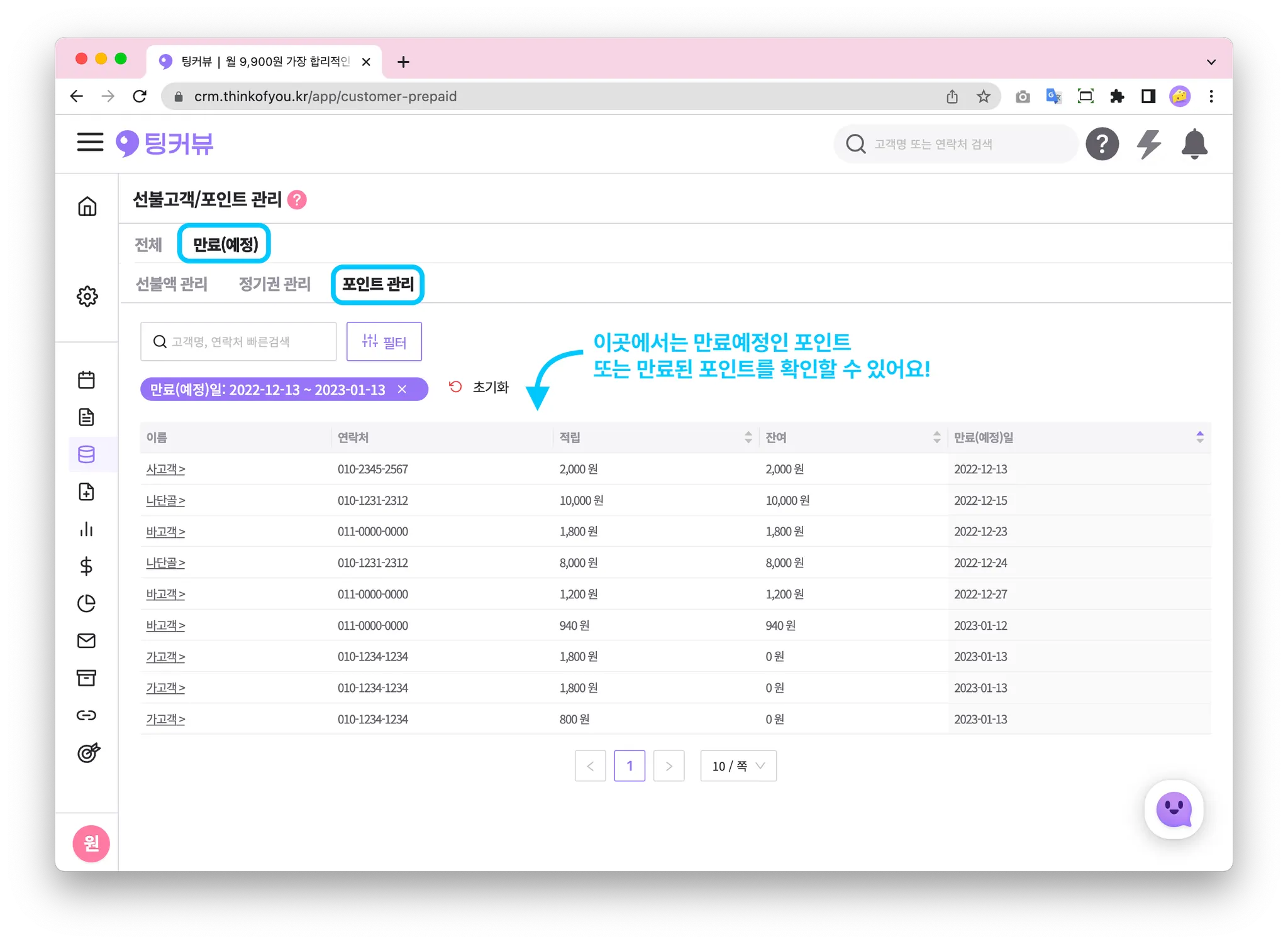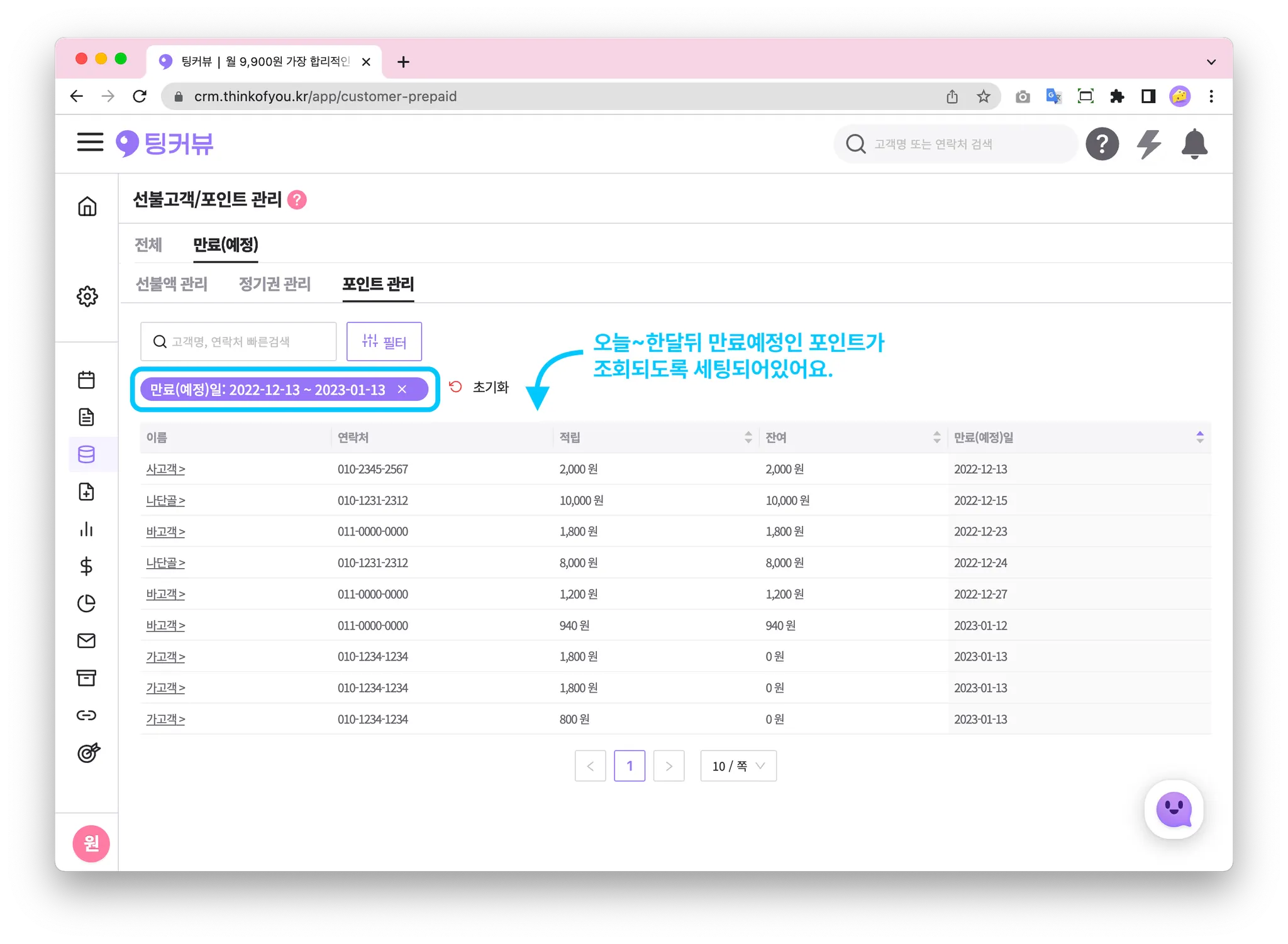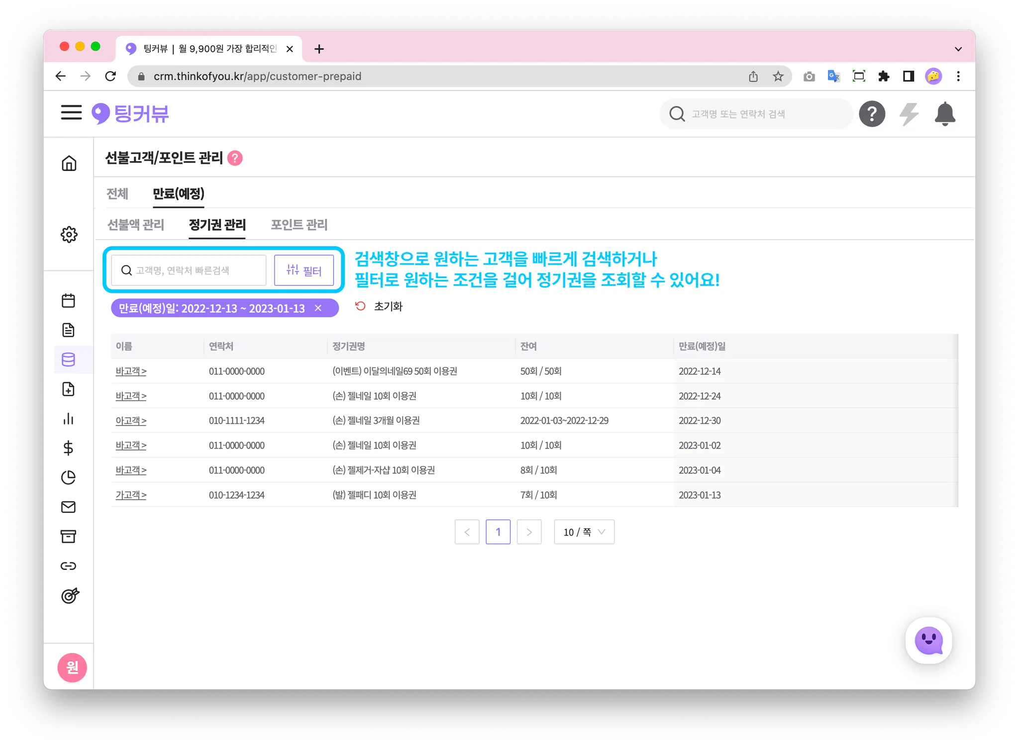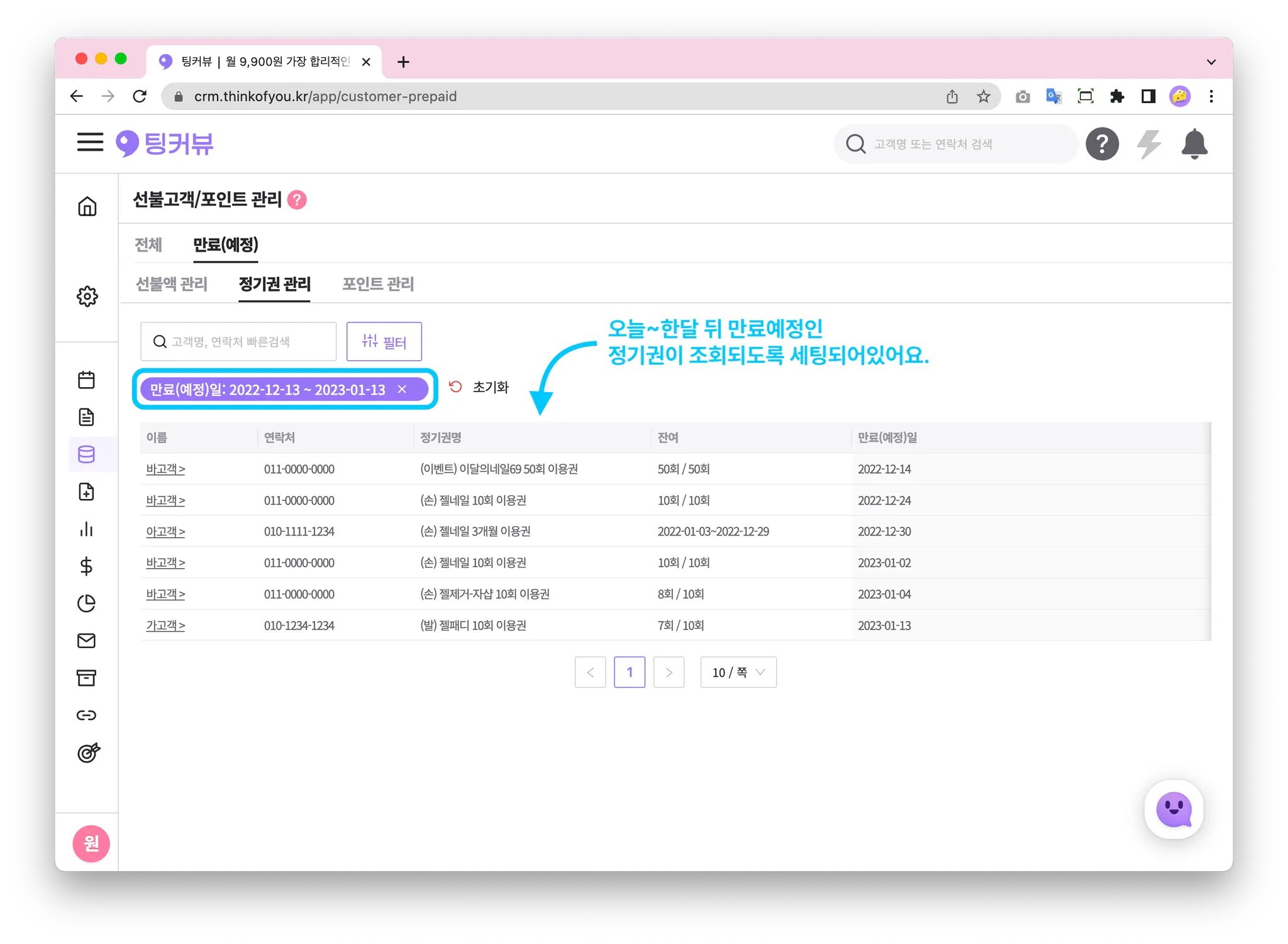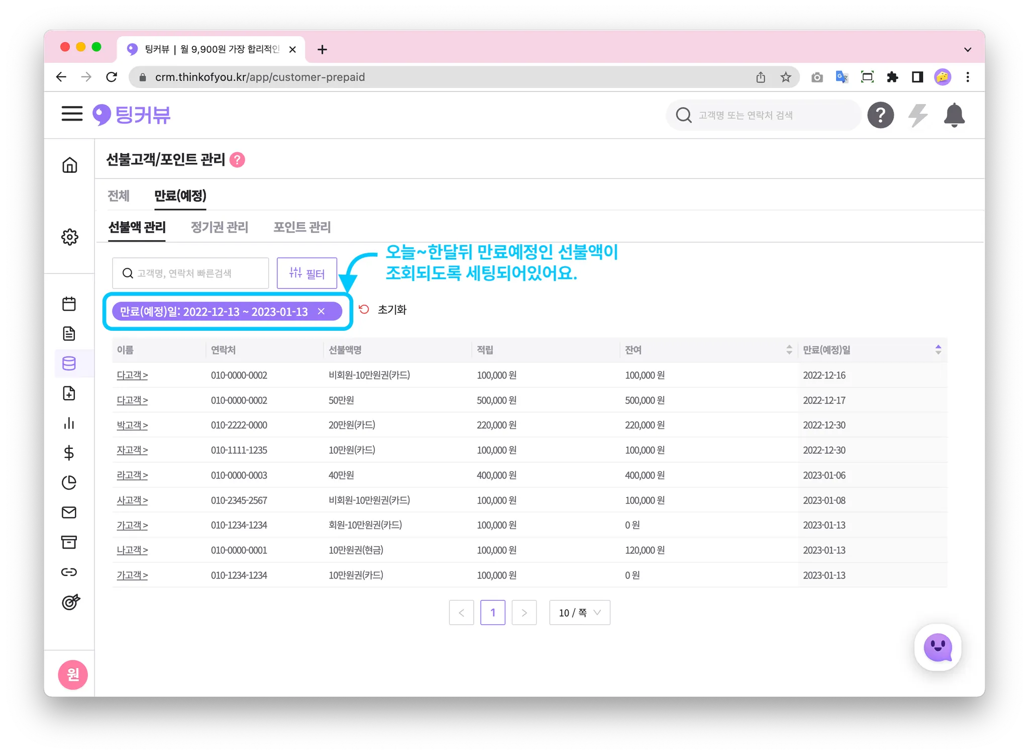 필터를 이용해 만료(예정)일을 원하는 조건으로 검색할 수 있어요.