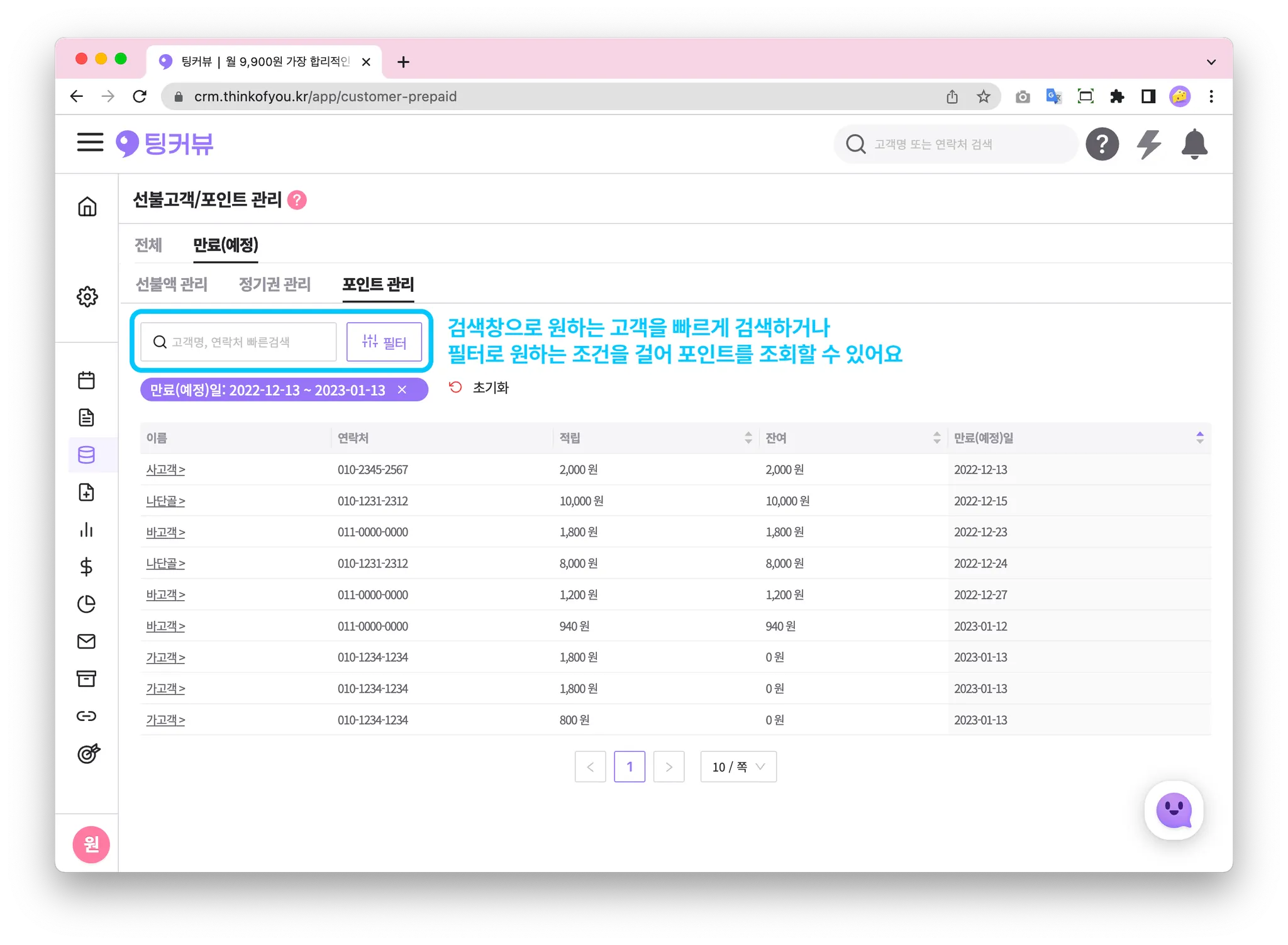 검색창으로 원하는 고객을 빠르게 검색하거나, 필터로 원하는 조건을 걸어 포인트를 조회할 수 있어요!