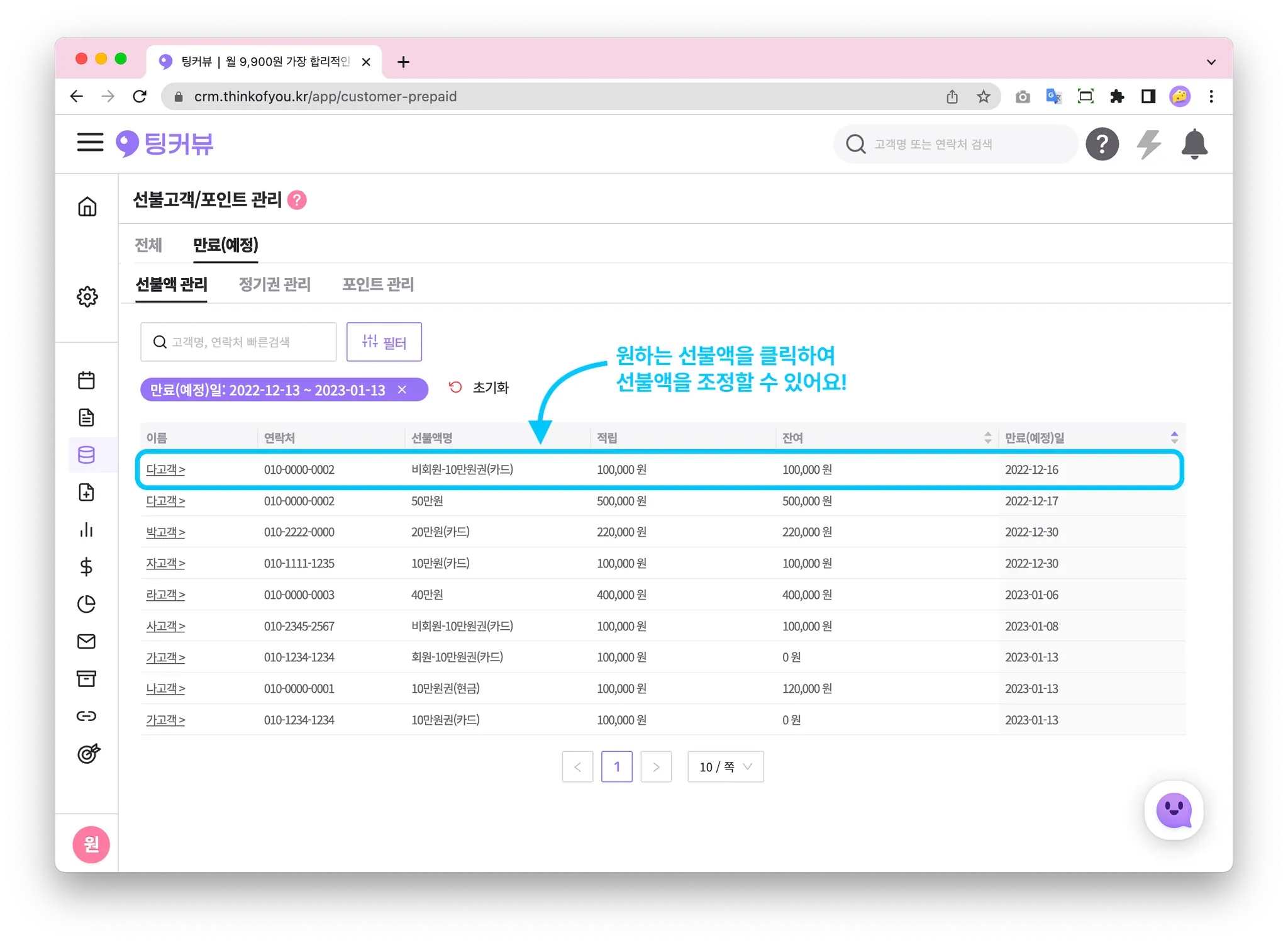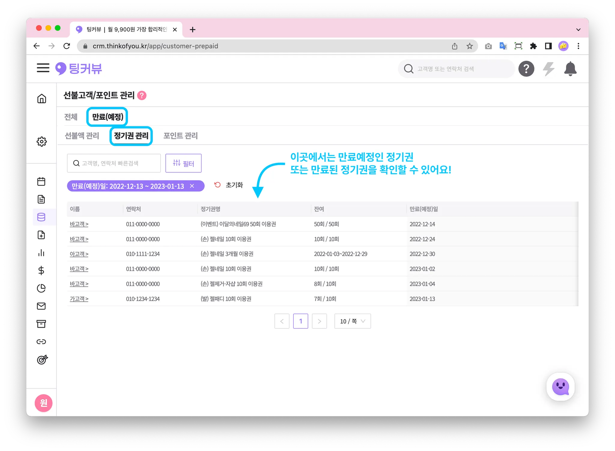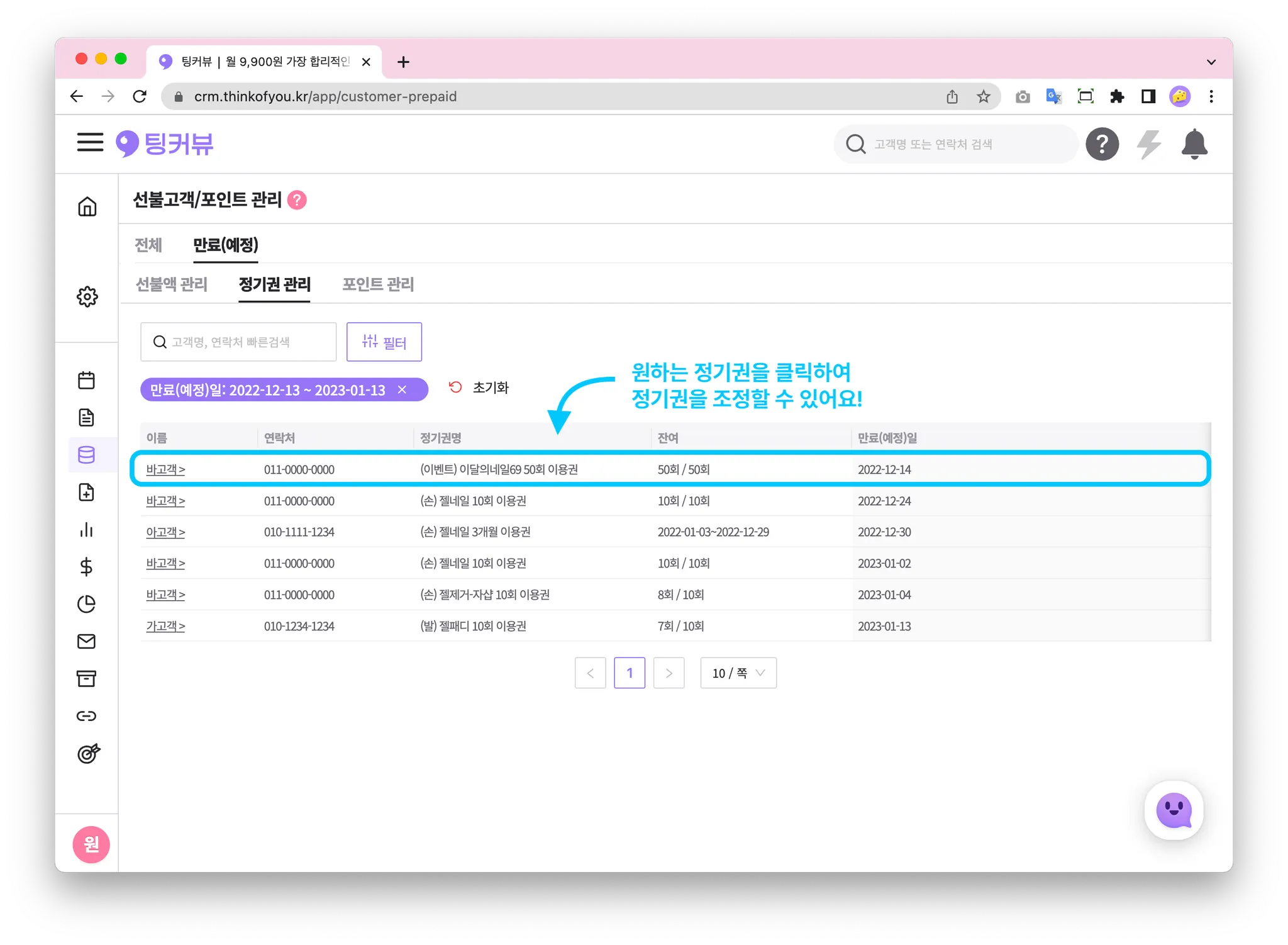 만료일이 다가오는 선불액∙정기권∙포인트를 관리하고 싶다면? 만료(예정) 탭을 이용해보세요! 고객을 한 눈에 모아보고 잔여량을 조정하거나 유효기간을 변경하는 등 편집을 쉽게 할 수 있어요!