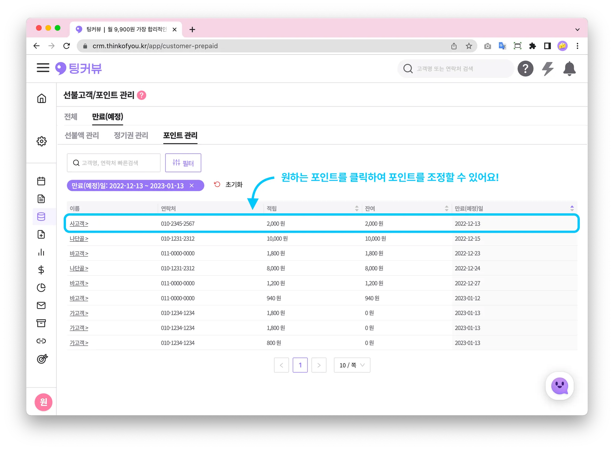 선택한 포인트를 보유한 고객의 잔여포인트를 조정할 수 있어요.