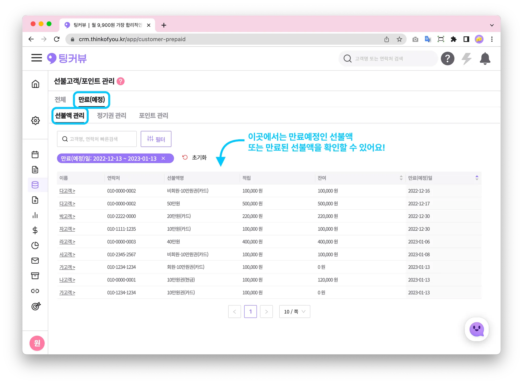 이곳에서는 만료예정인 선불액 또는 만료된 선불액을 확인할 수 있어요!