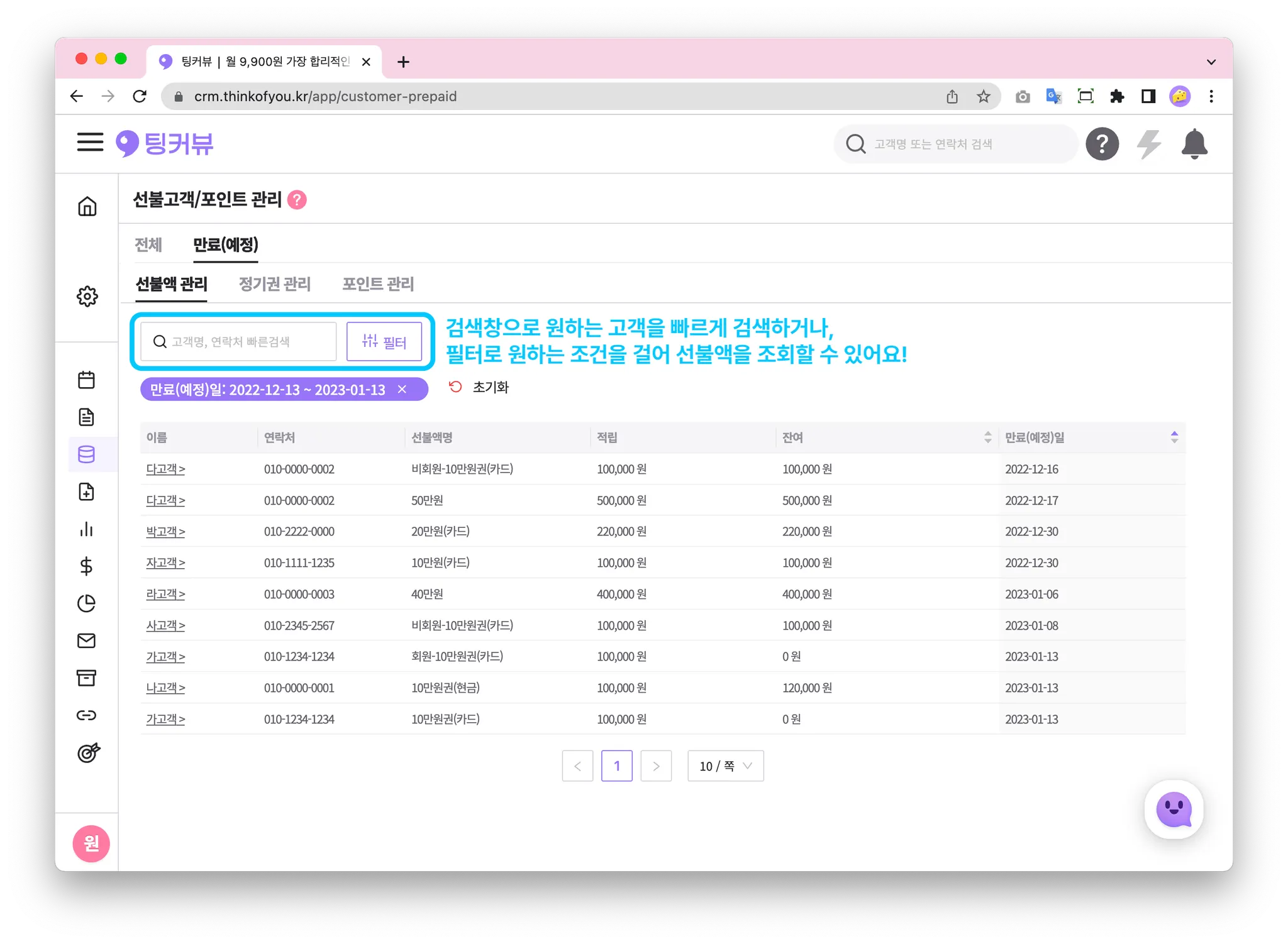 검색창으로 원하는 고객을 빠르게 검색하거나, 필터로 원하는 조건을 걸어 선불액을 조회할 수 있어요!