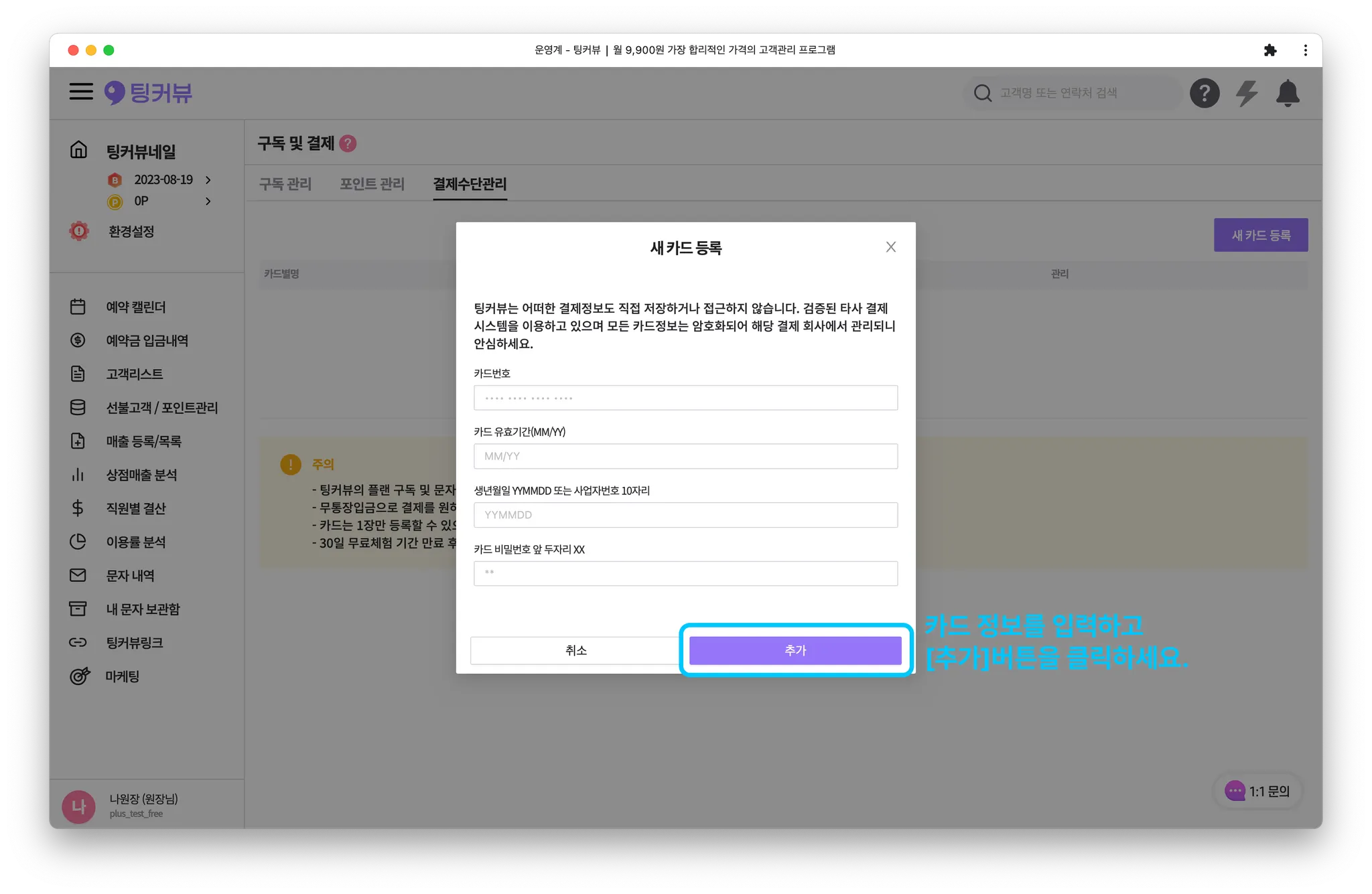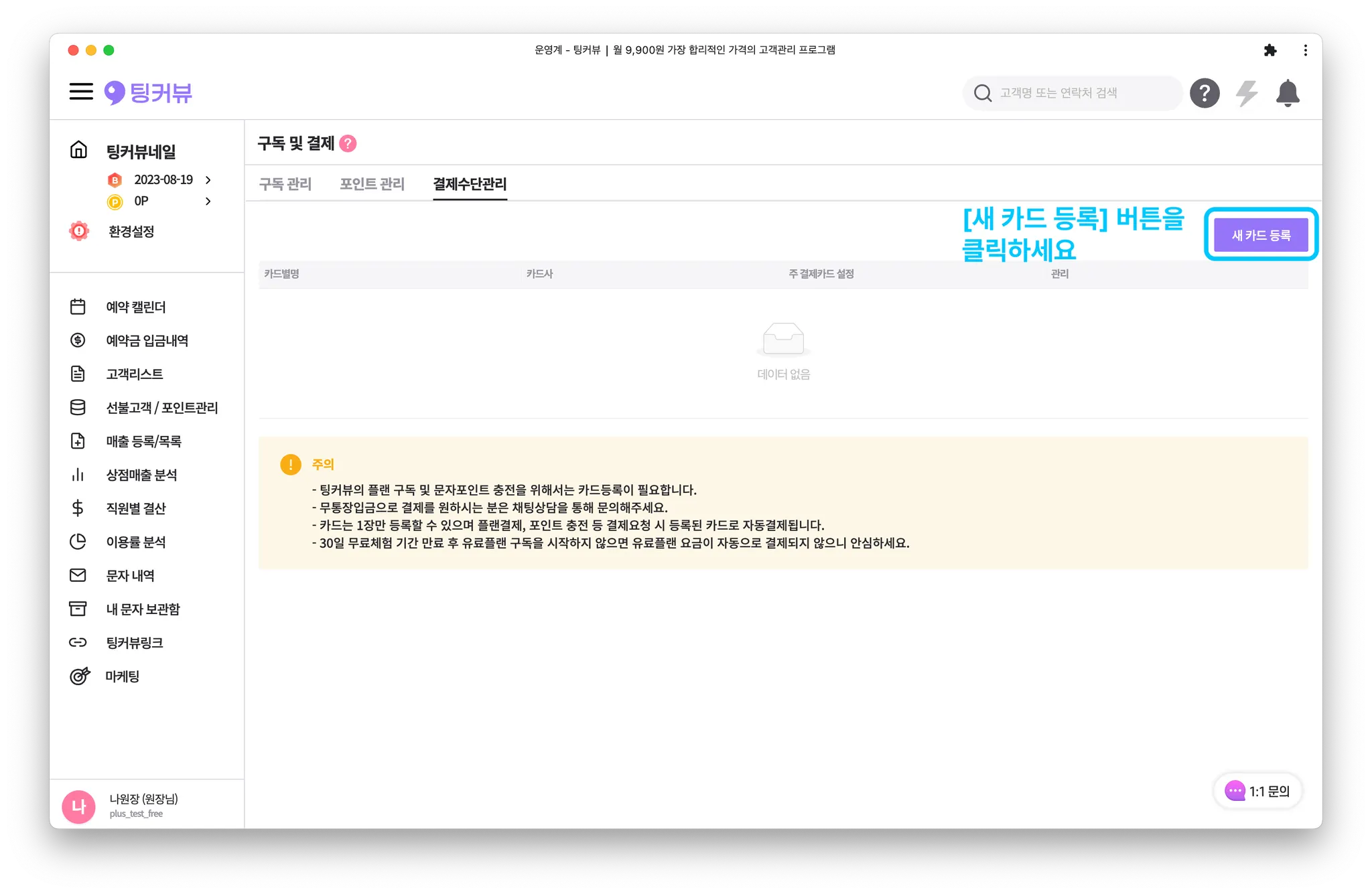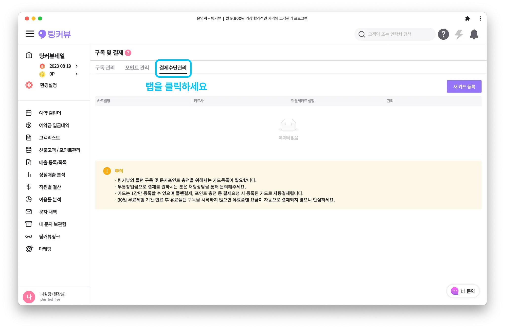 팅커뷰는 프로그램내에서 카드결제만 지원하고 있어요! 플랜 구독, 문자포인트 충전을 위해서 결제카드를 우선 등록해주세요