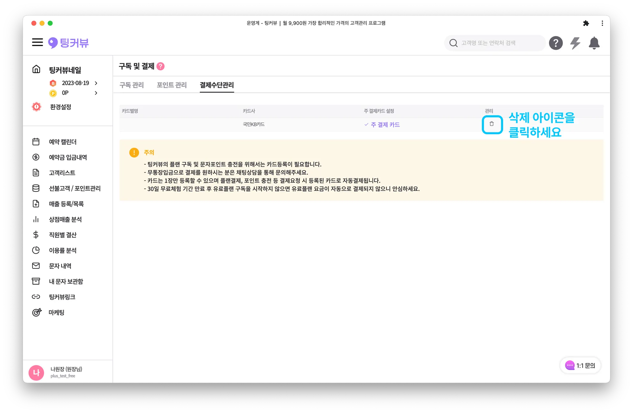 주의! 카드를 삭제하면 플랜구독일에 구독이 해지되고 유료플랜이 무료플랜으로 전환될 수 있어요!