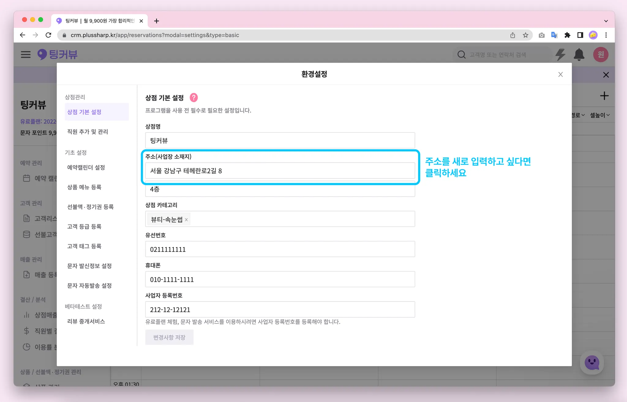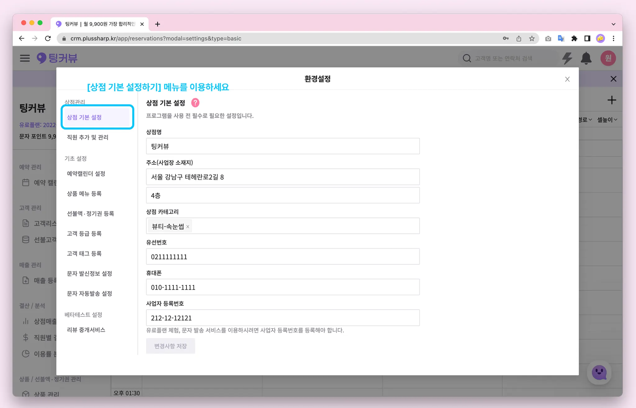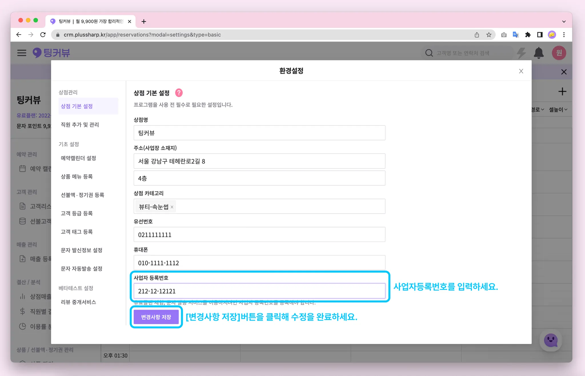 상점 기본 설정 메뉴에서 사업자등록번호를 새로 입력해주세요.