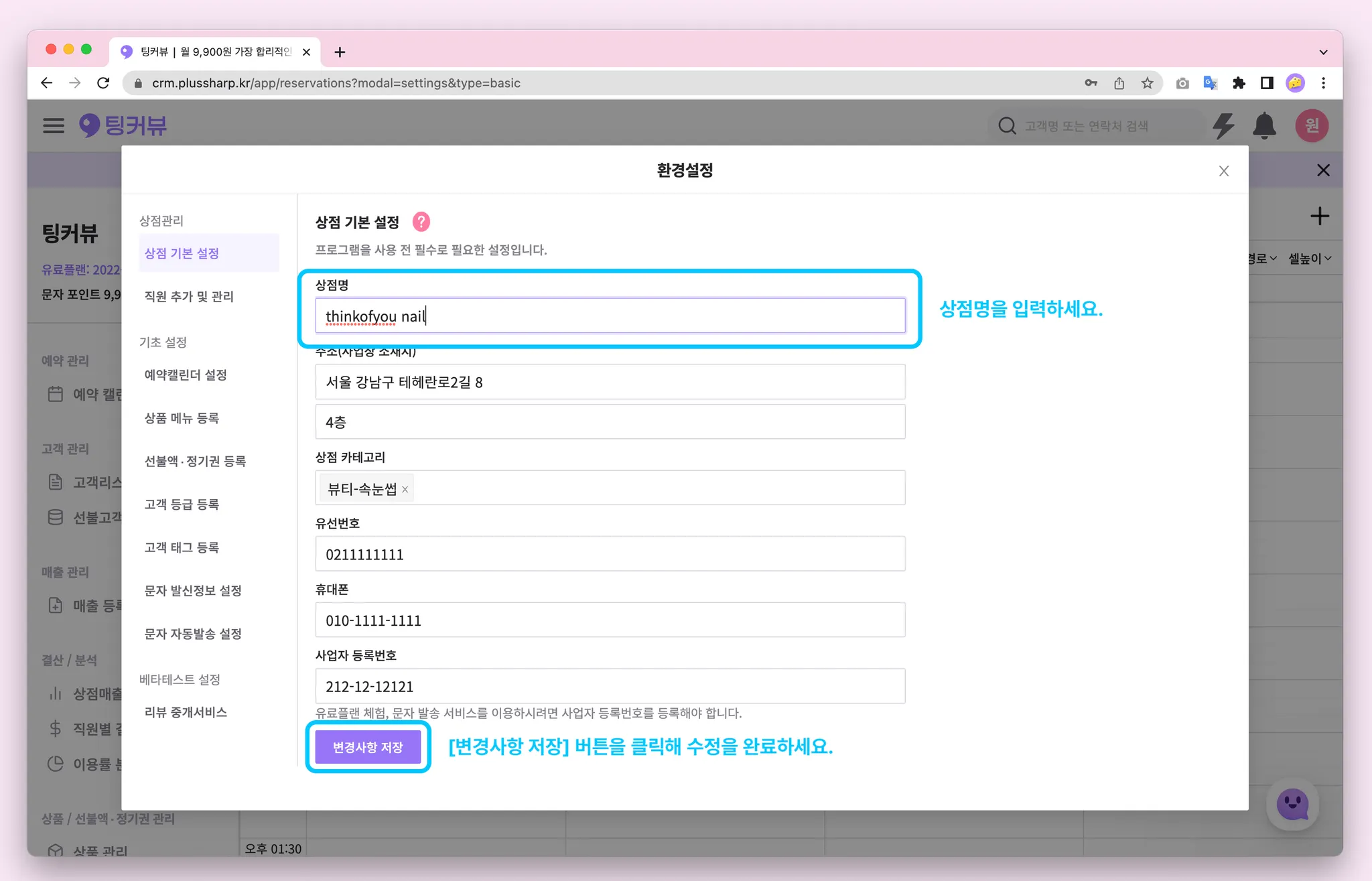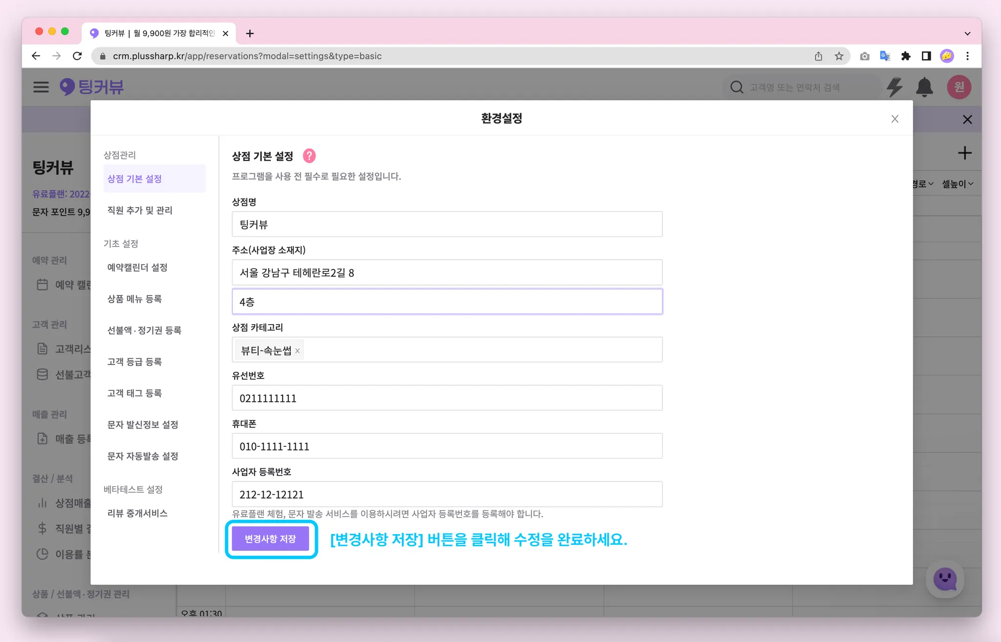 마지막으로 변경사항 저장 버튼을 클릭하면 상점 유선번호 변경완료!