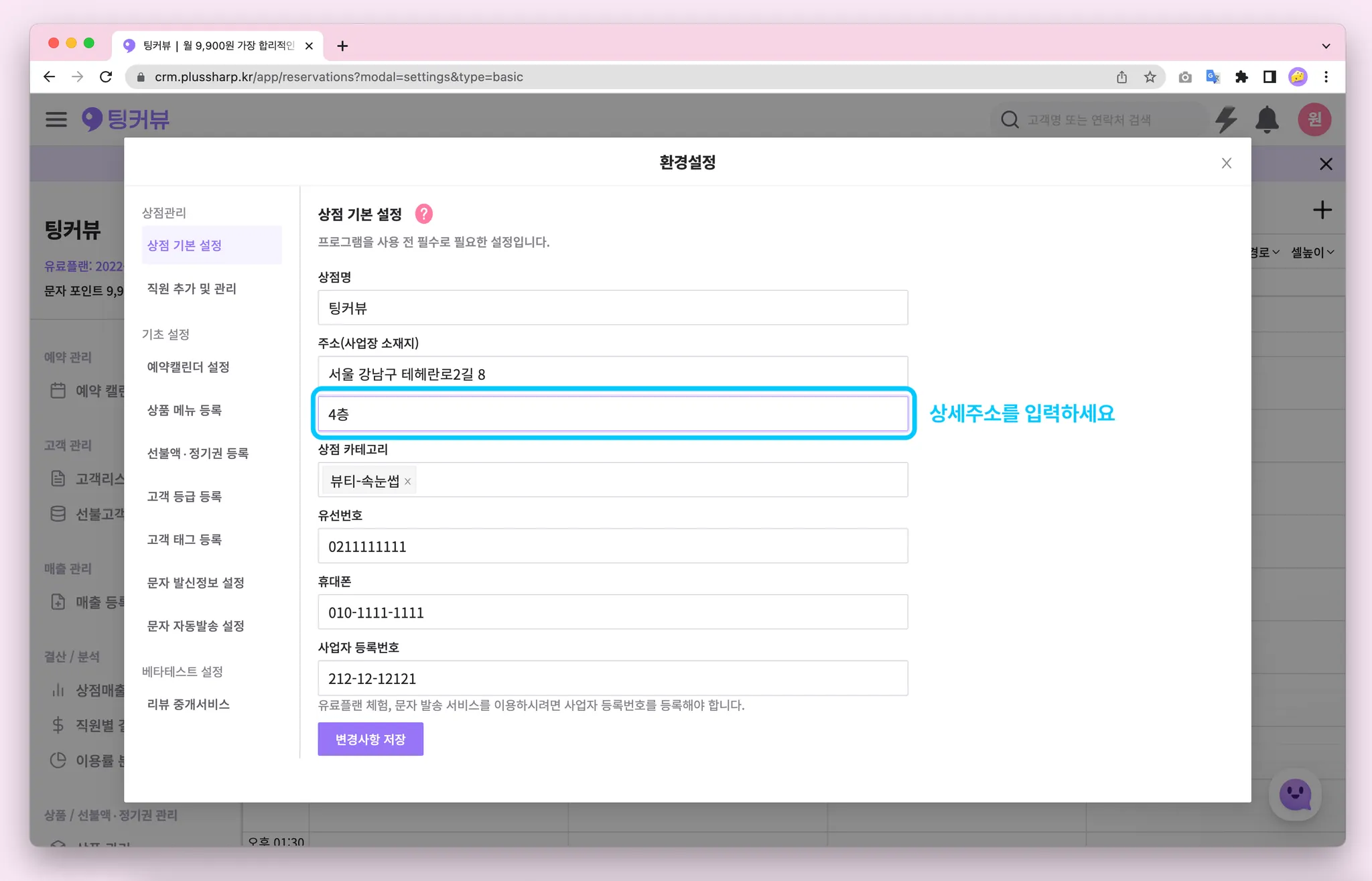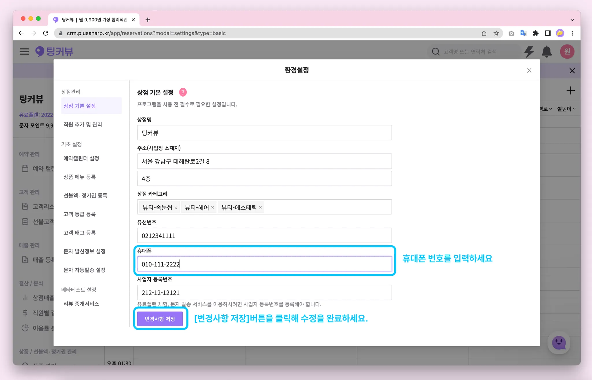 마지막으로 변경사항 저장 버튼을 클릭하면 상점 휴대폰번호 변경완료!