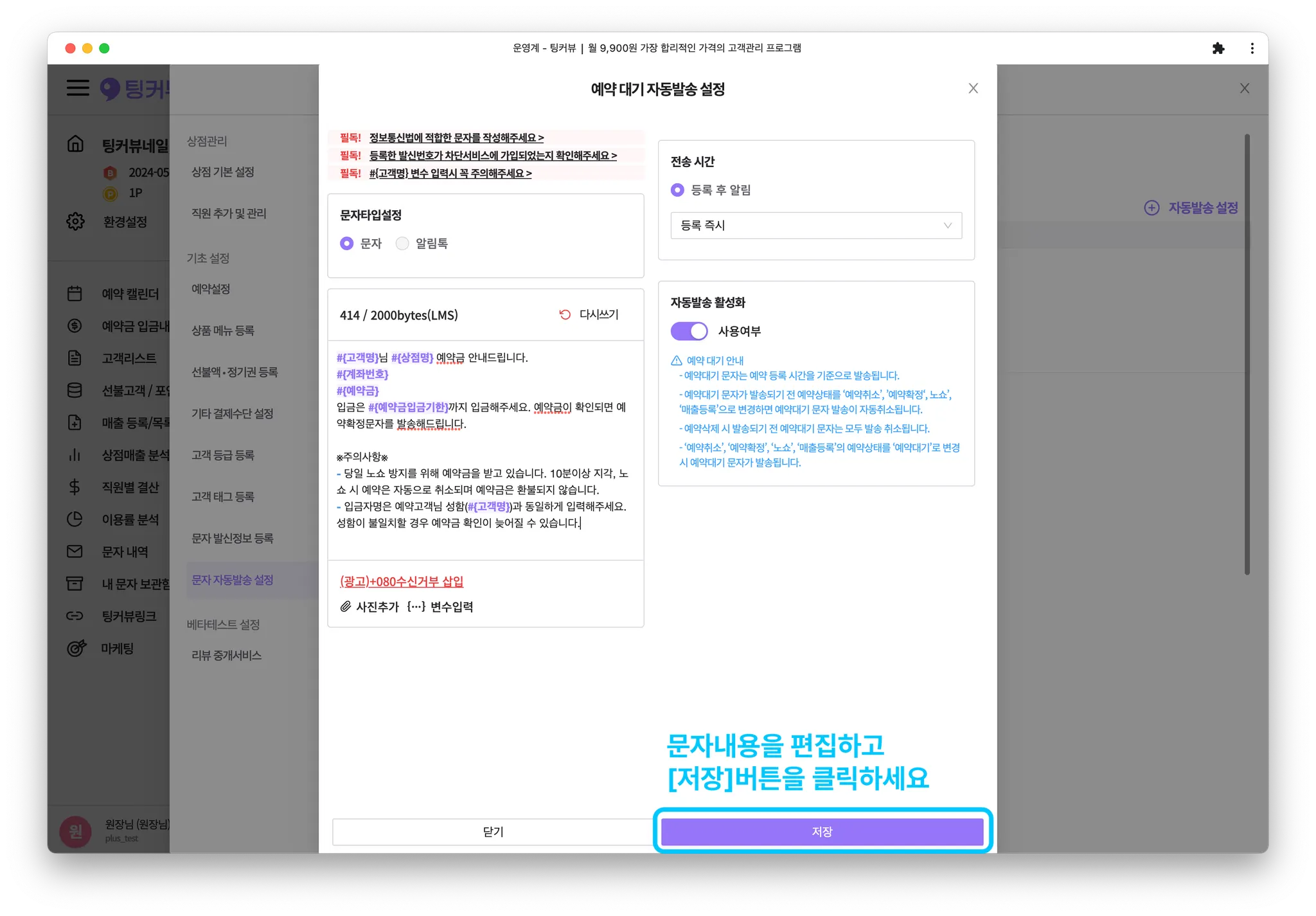문자내용을 상점에 맞춰 수정하고 하단의 [저장]버튼을 클릭하면 설정이 완료됩니다.