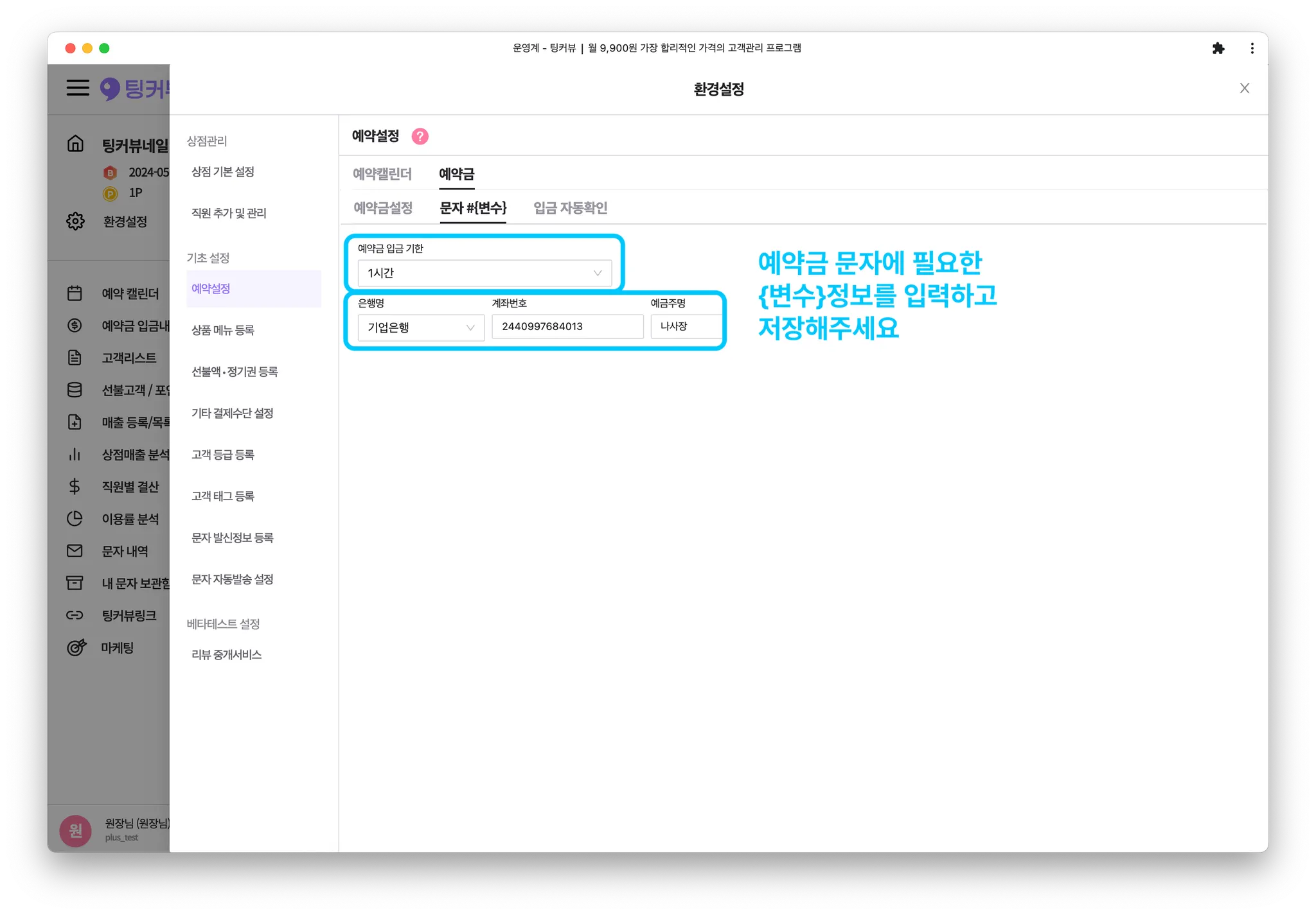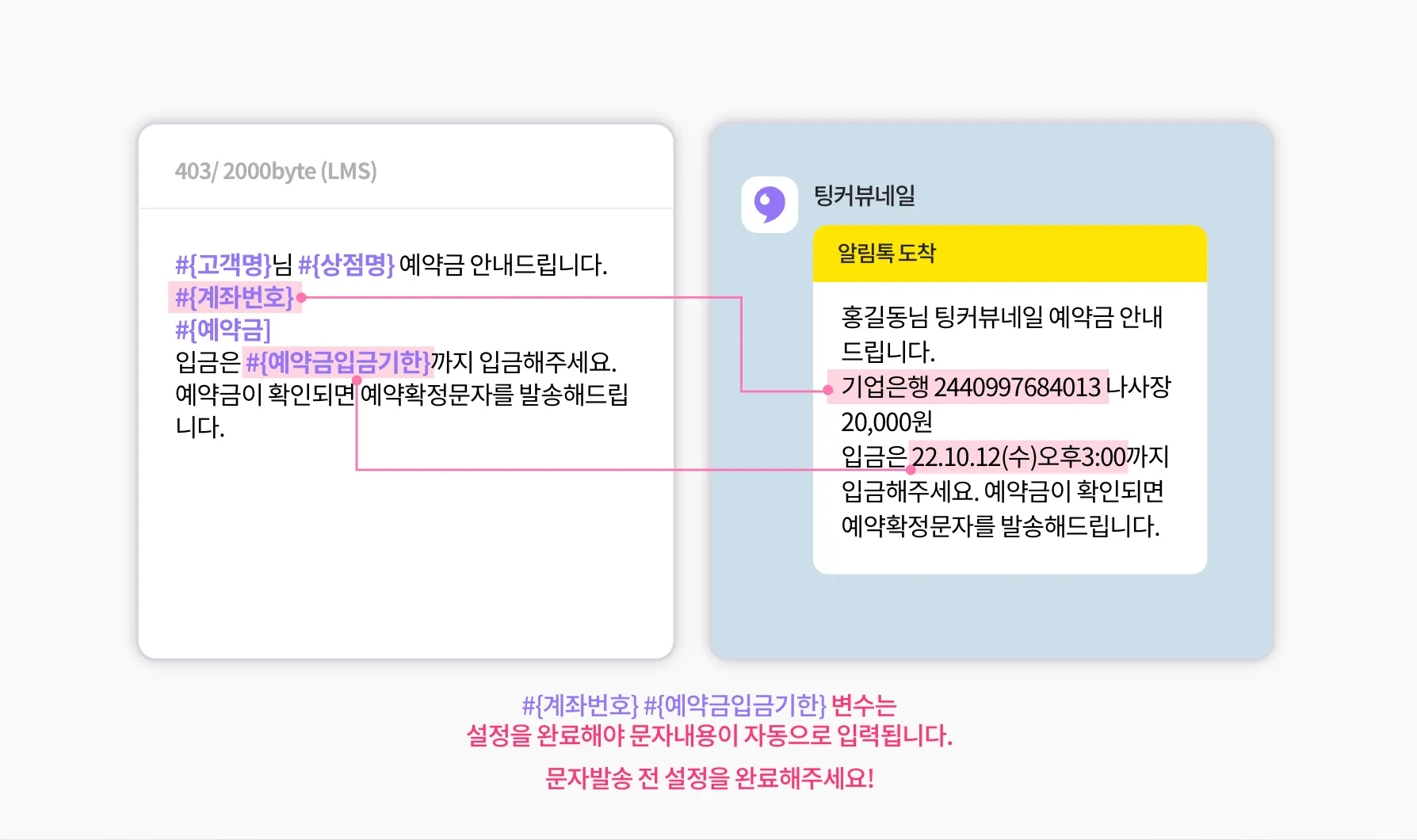 예약대기 문자에는 5개의 #{변수}정보가 입력되는데요! 이 중 #{계좌번호}와 #{예약금입금기한}변수는 직접 정보를 입력해 설정을 완료해야 합니다