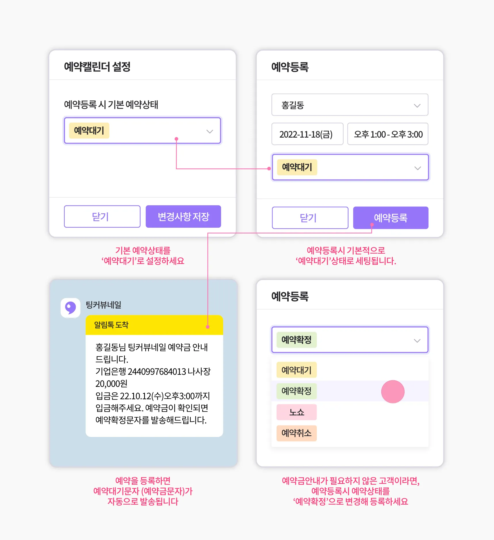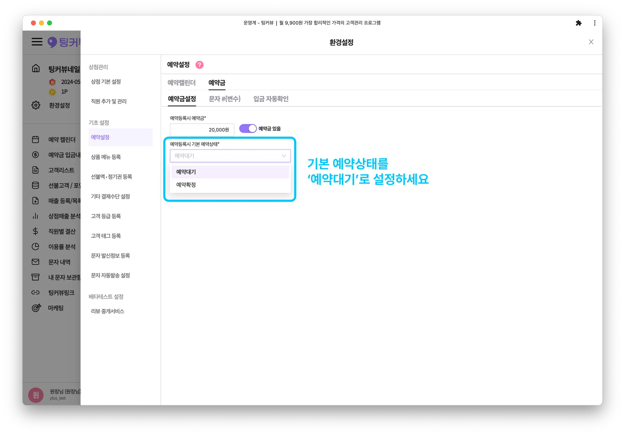 [예약등록시 기본 예약상태] 를 ‘예약대기’로 설정해주세요. (예약등록시 예약금문자가 자동으로 발송됩니다)