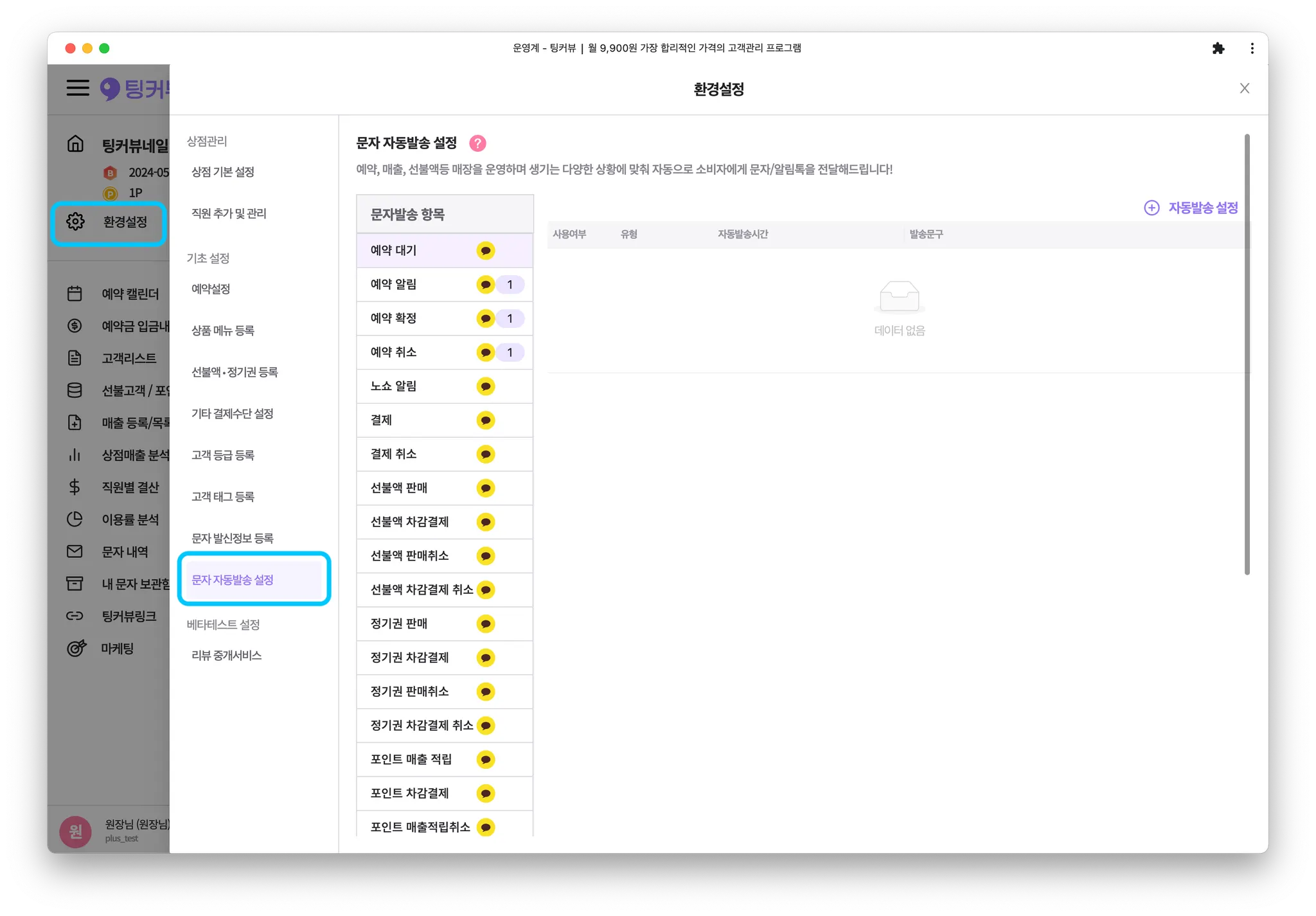 사이드메뉴에서 [환경설정] 버튼을 클릭하고 [문자 자동발송 설정] 메뉴를 클릭해주세요.