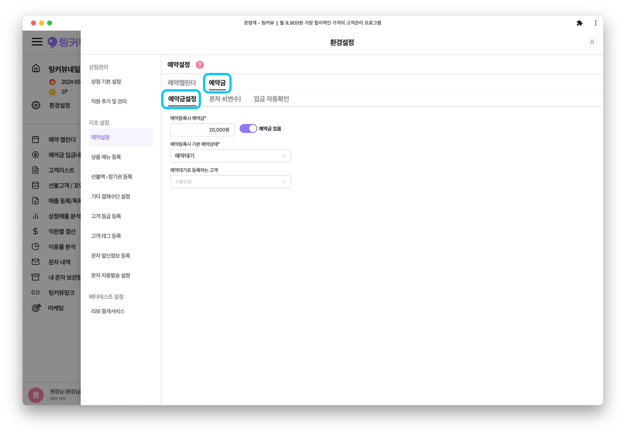 [예약금] - [예약금설정] 탭을 클릭하세요.