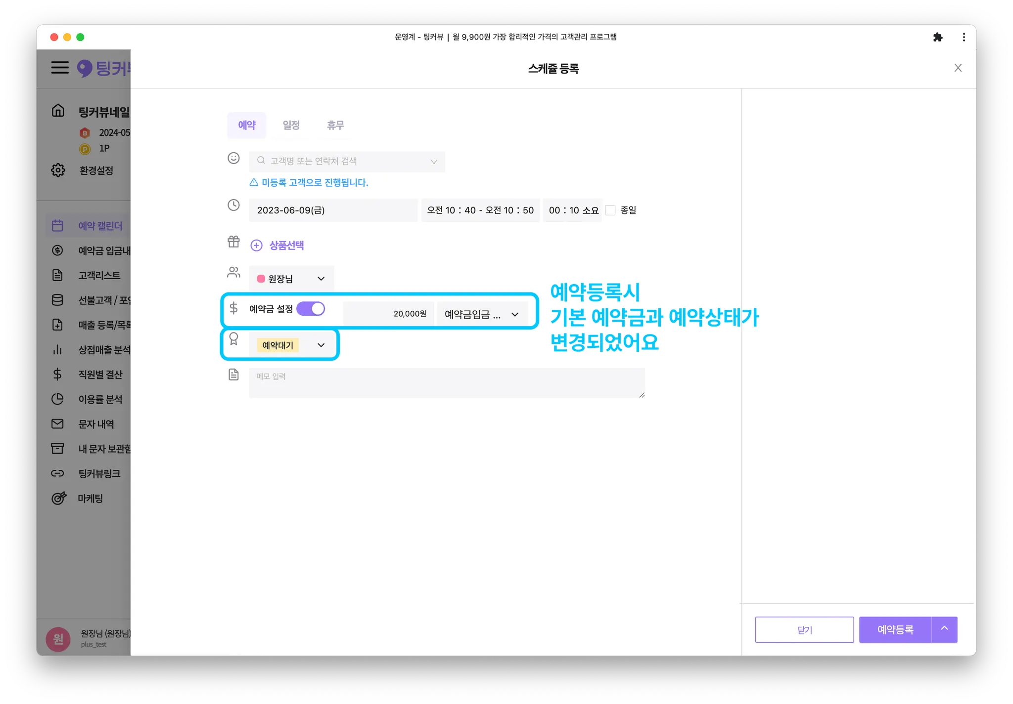예약등록시 기본 예약금과 예약상태가 변경되었어요!