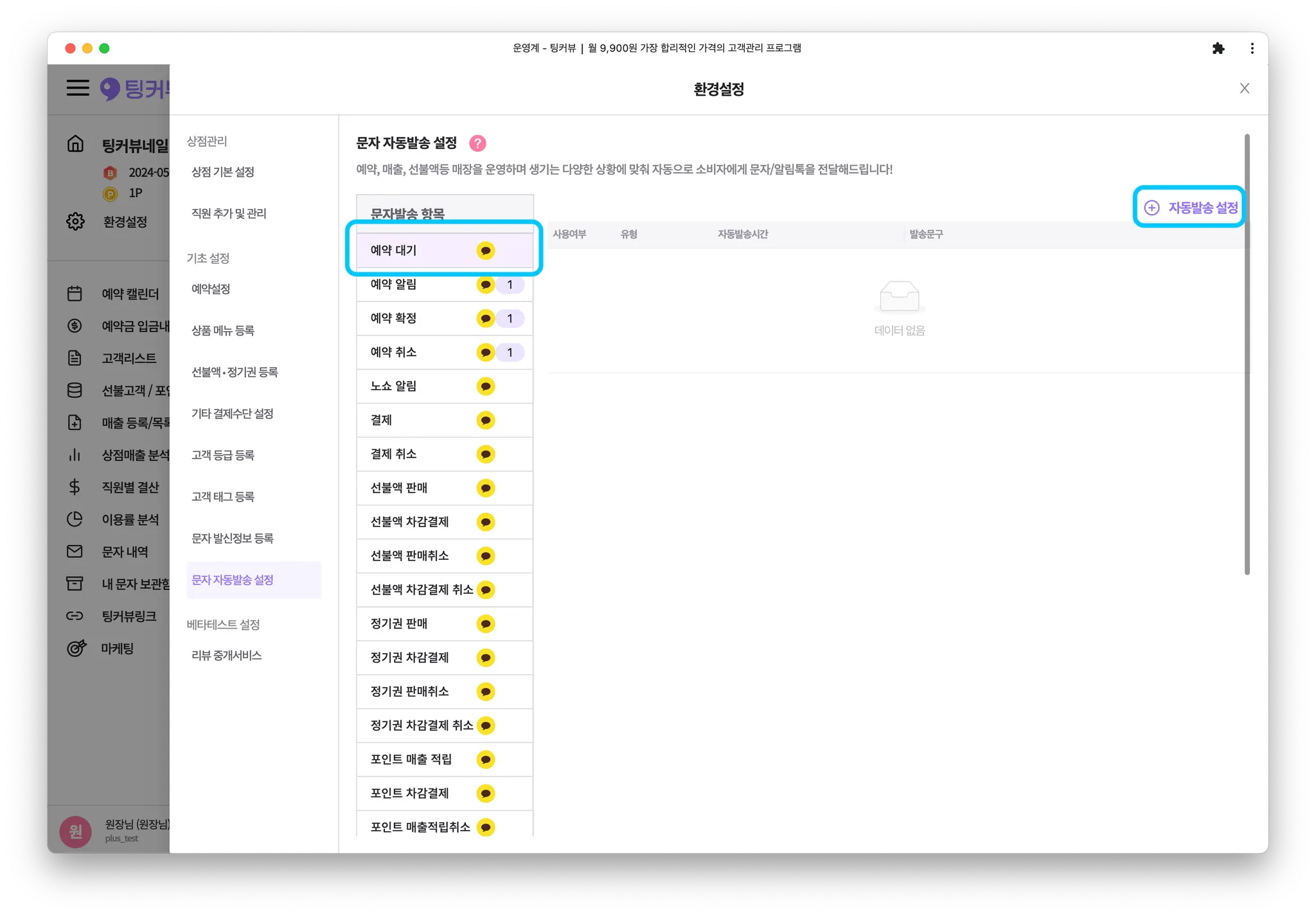 문자발송 항목 중 [예약대기]문자를 선택하고 우측의 [+ 자동발송 설정] 버튼을 클릭해주세요.
