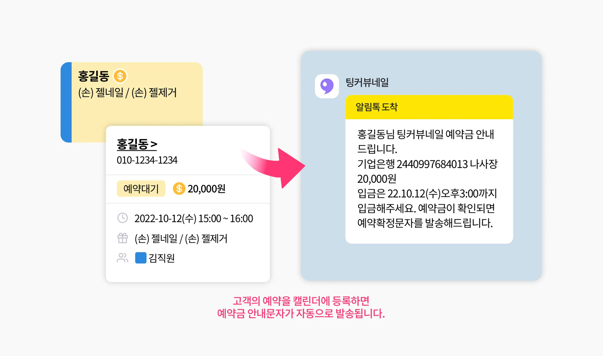 혹시,, 아직도 매번 입력해 예약금 문자를 발송하시나요? 이제 문자 자동발송으로 예약금안내도 간편하게 관리해보세요!