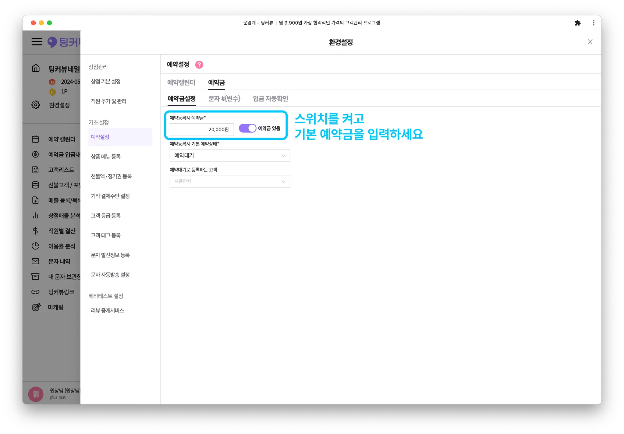 [예약등록시 예약금] 설정의 스위치를 켜서 ‘예약금있음’상태로 설정해주세요.