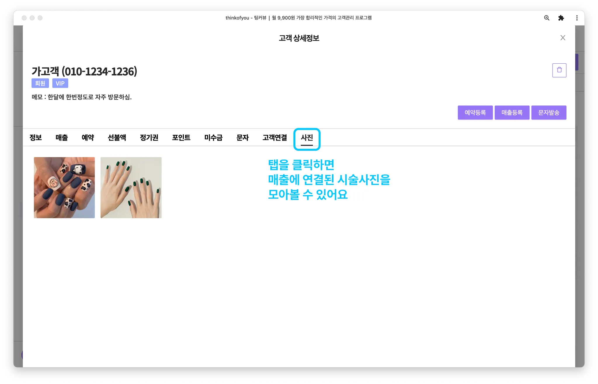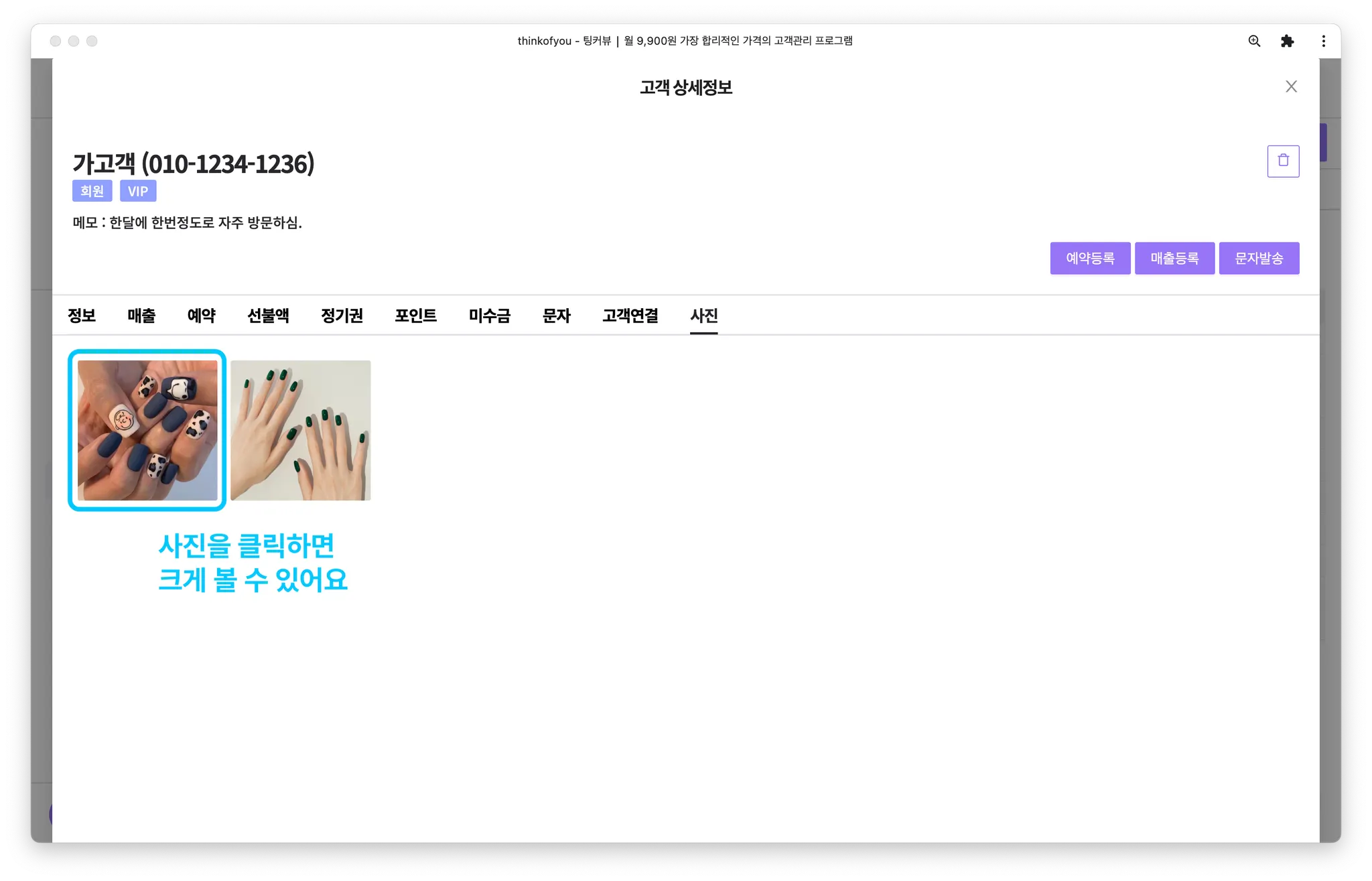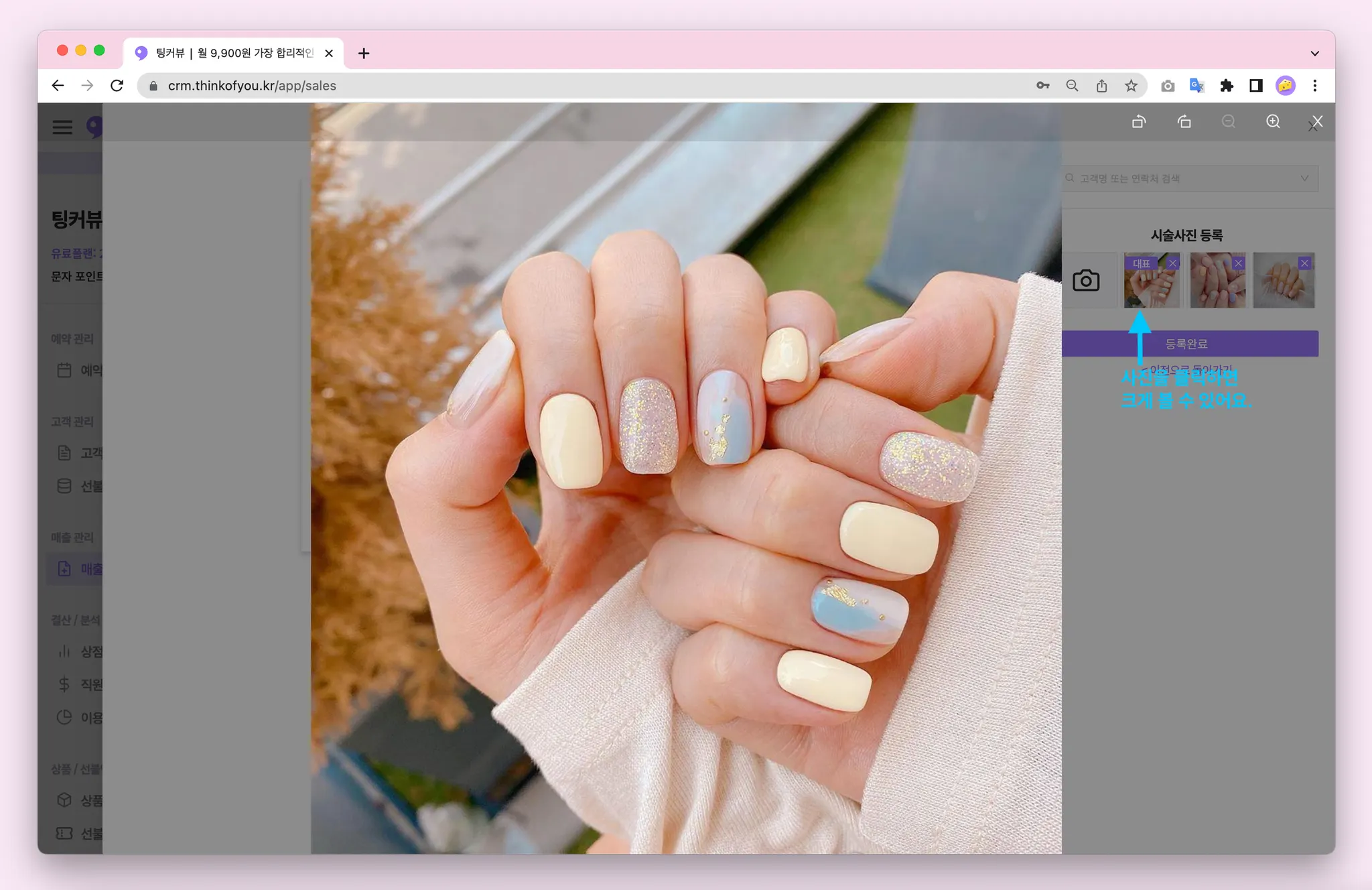 매출마다 등록한 시술사진! 한 번에 모아보고 싶다면? 고객 상세페이지를 이용해주세요! 고객 앞으로 등록한 모든 시술사진을 확인할 수 있어요!
