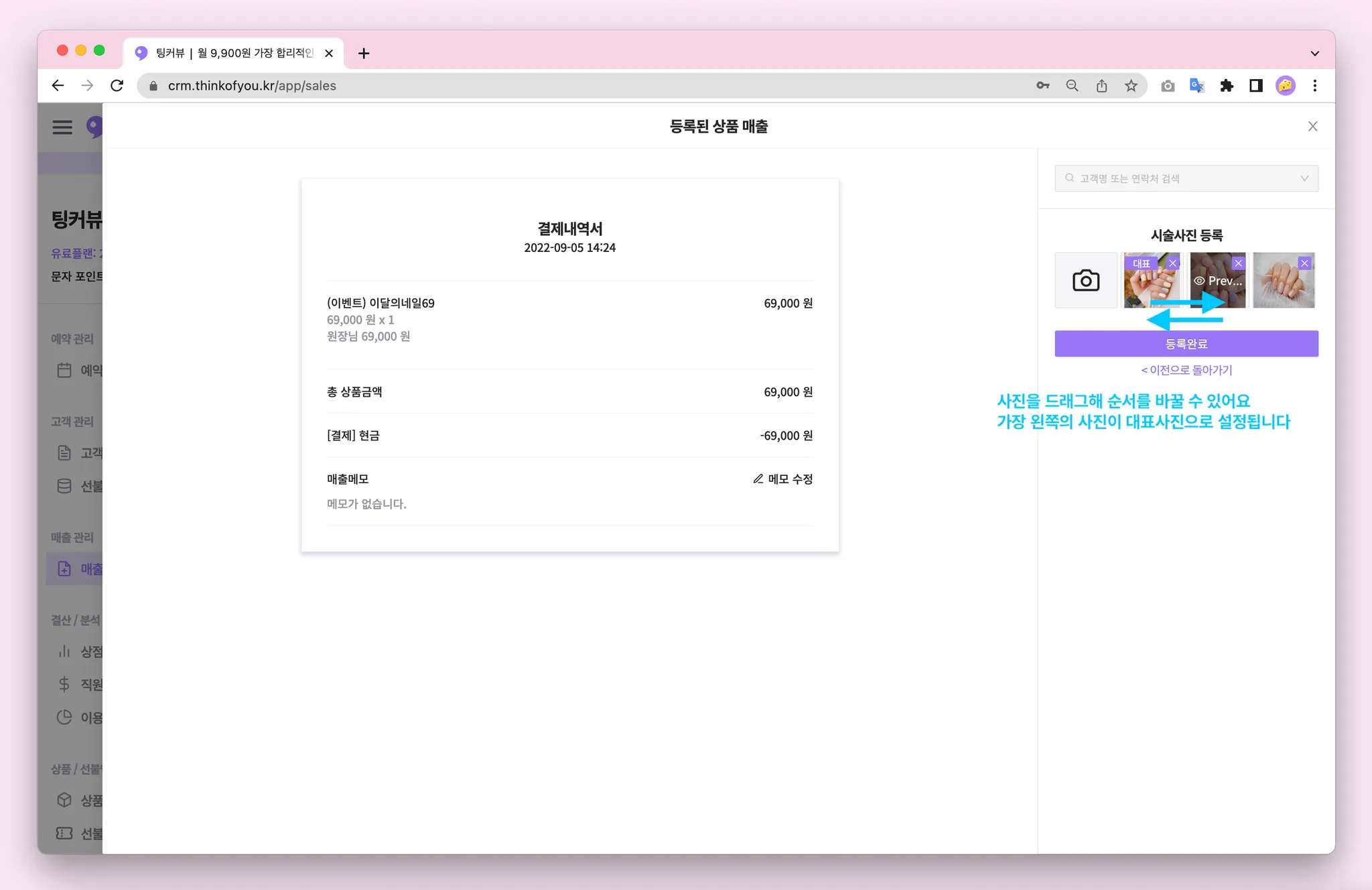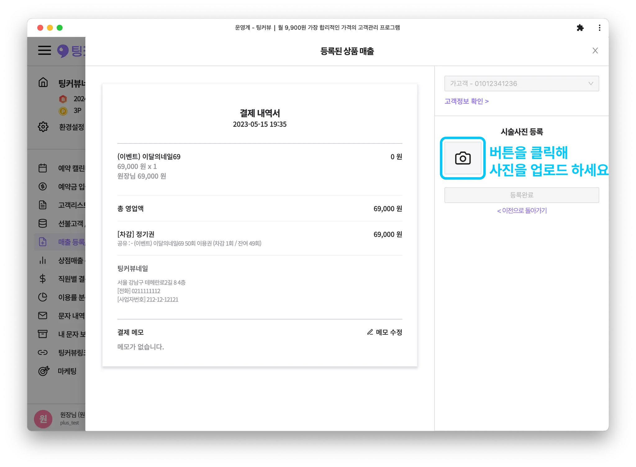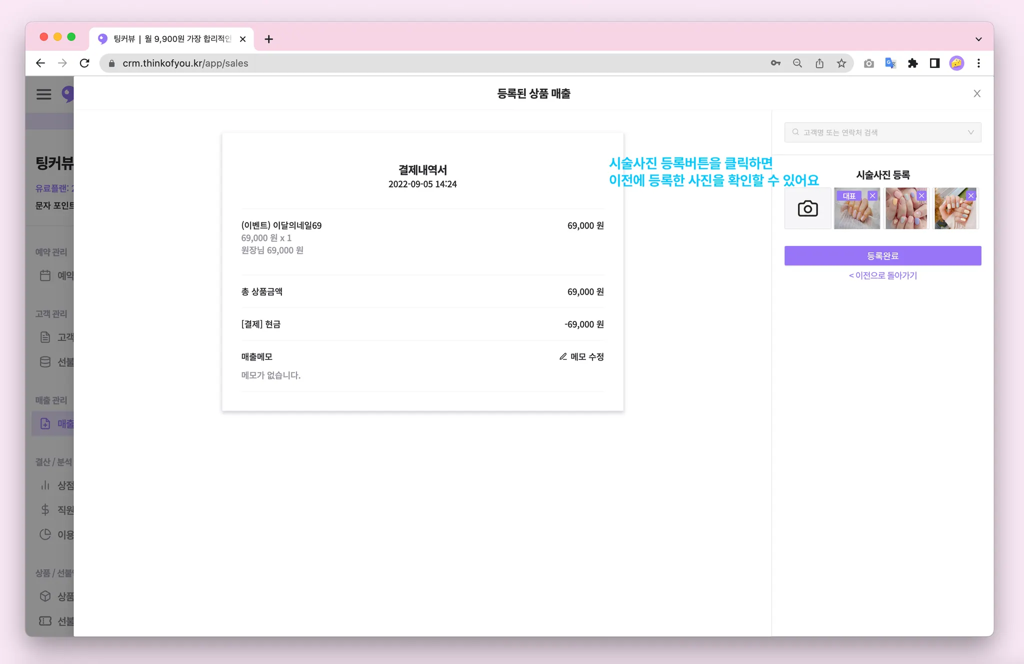 등록한 시술사진은 다시 등록된 상품매출 화면에서 확인할 수 있어요.